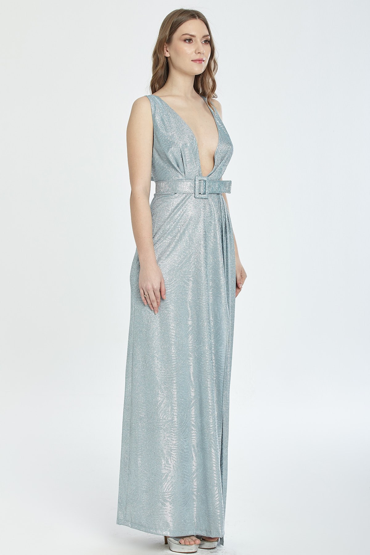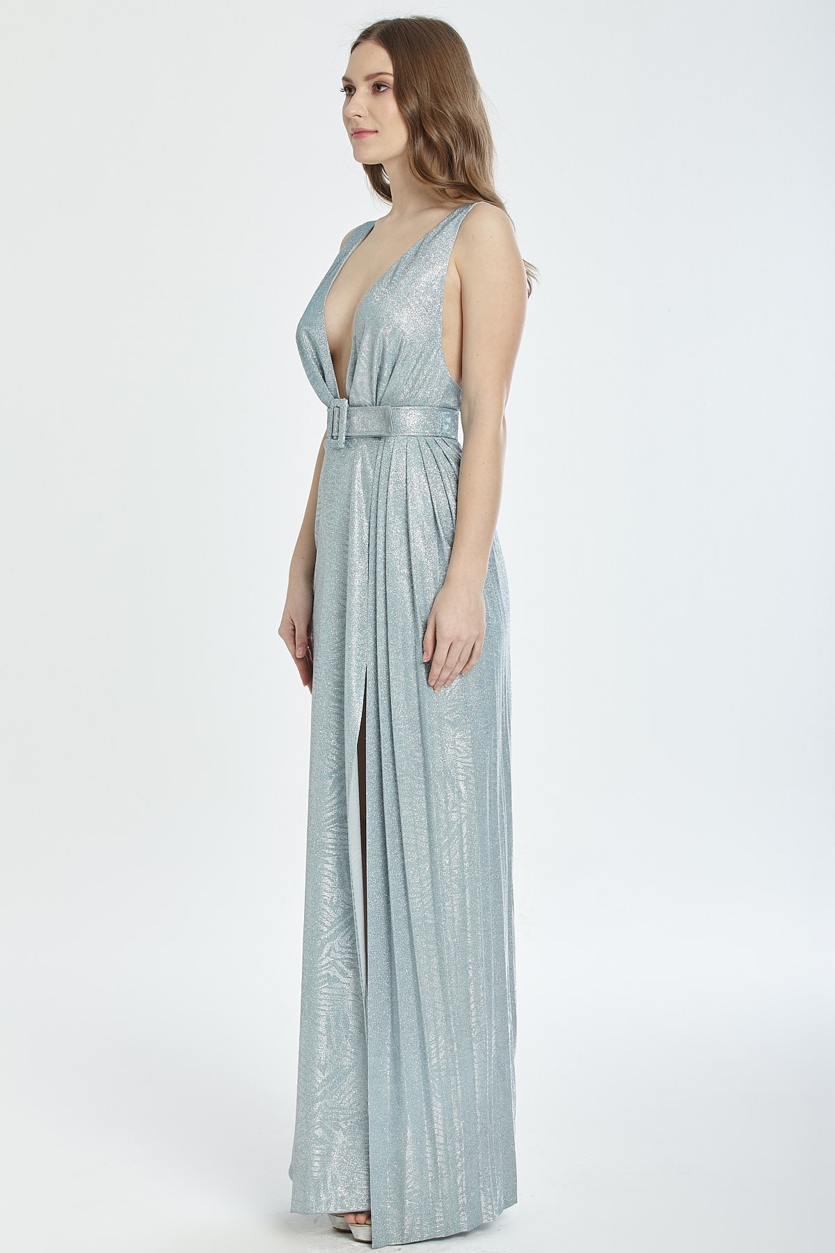 İnce askılı derin göğüs ve sırt dekolteli beli kemerli derin yırtmaçlı kendinden ışıltılı gece elbisesi