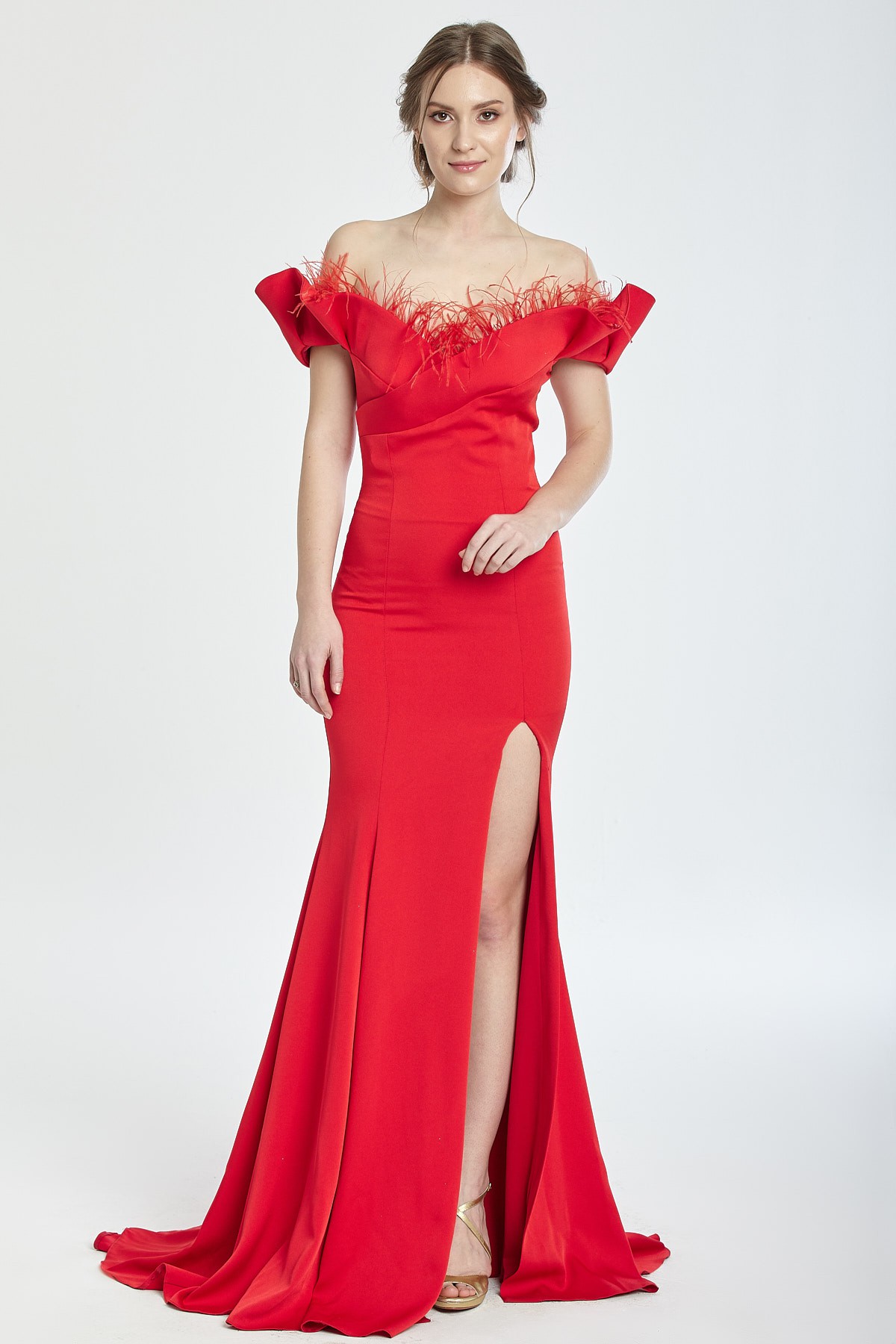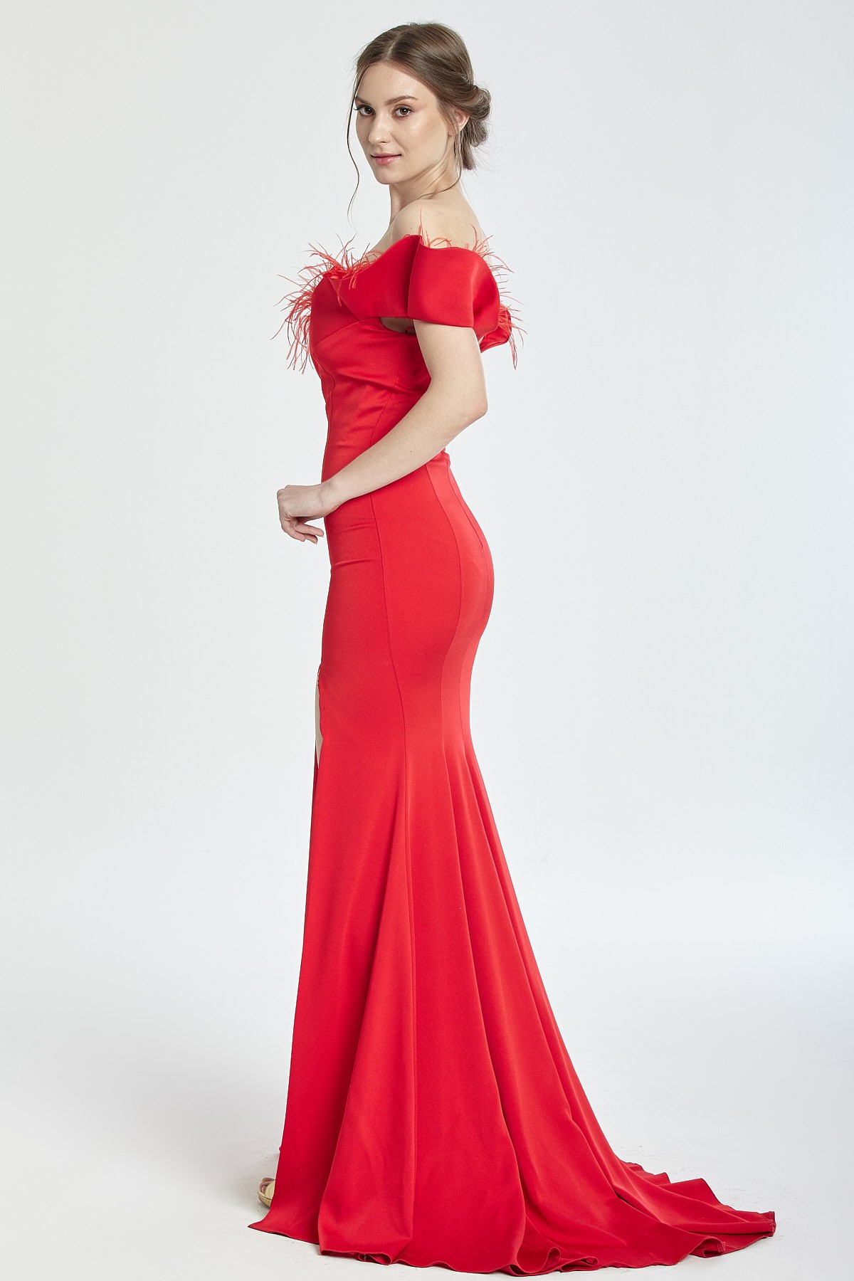 Kayık yaka göğsü tüy detaylı derin yırtmaçlı kuyruklu gece elbisesi