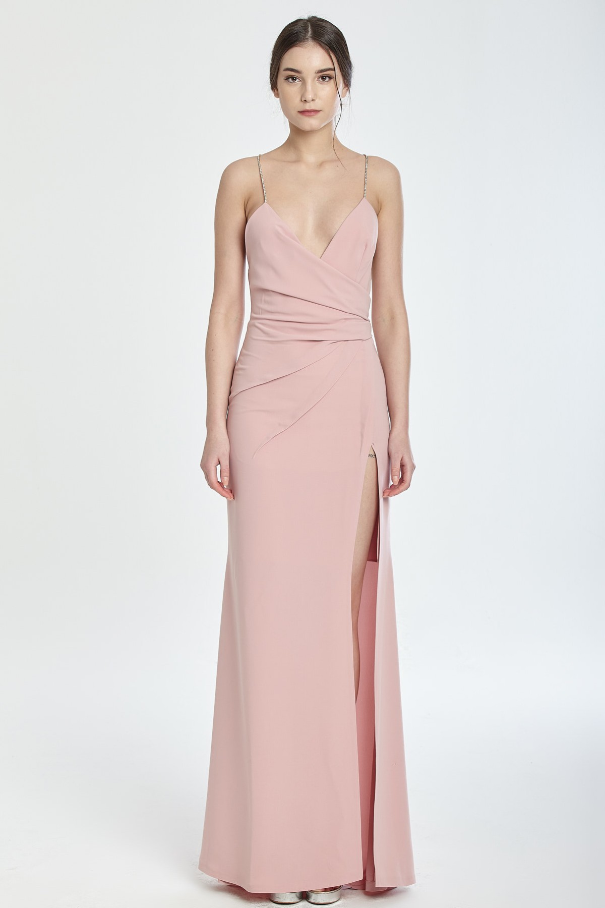 İnce taş askılı derin göğüs ve çarpraz sırt dekolteli beli drapeli derin yırtmaçlı kuyruklu gece elbisesi