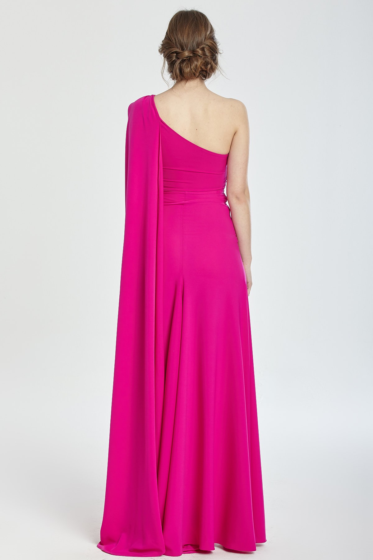 Tek omuz pelerin detaylı beli dekolteli derin yırtmaçlı A kesim gece elbisesi