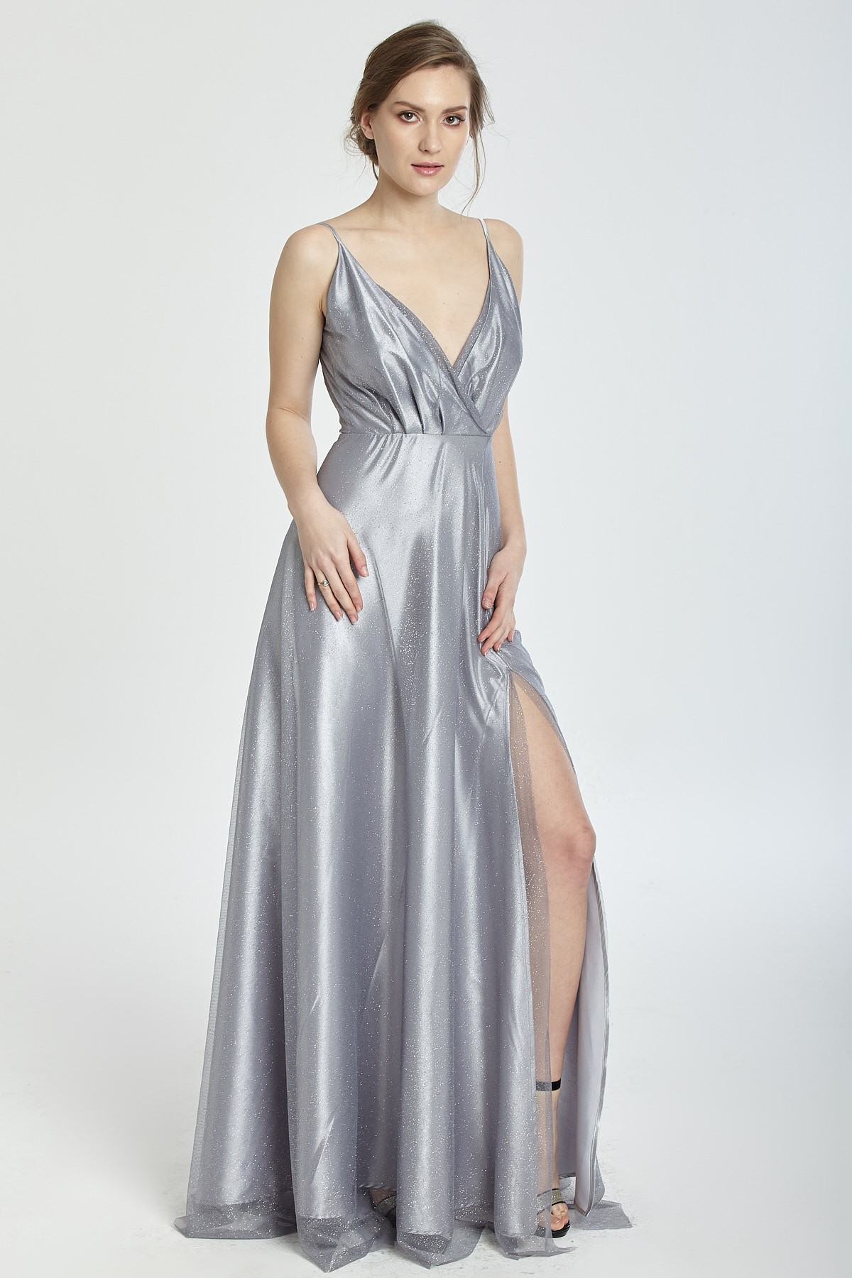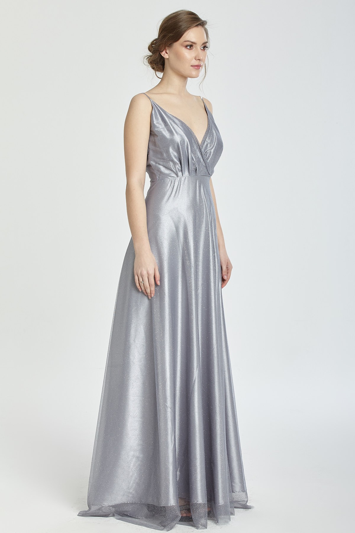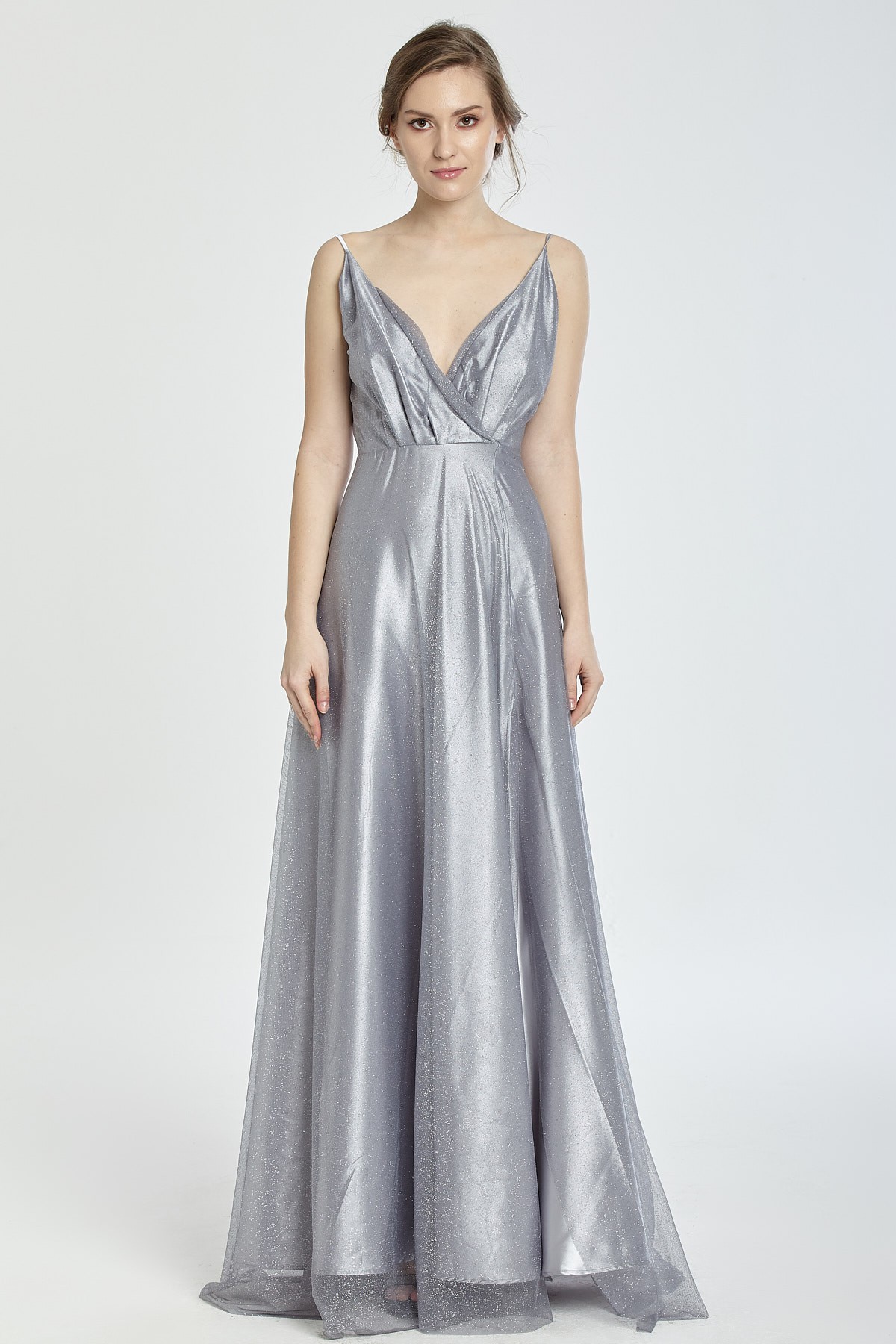 İnce askılı göğüs ve sırt dekolteli A kesim kendinden ışıltılı yırtmaçlı gece elbisesi