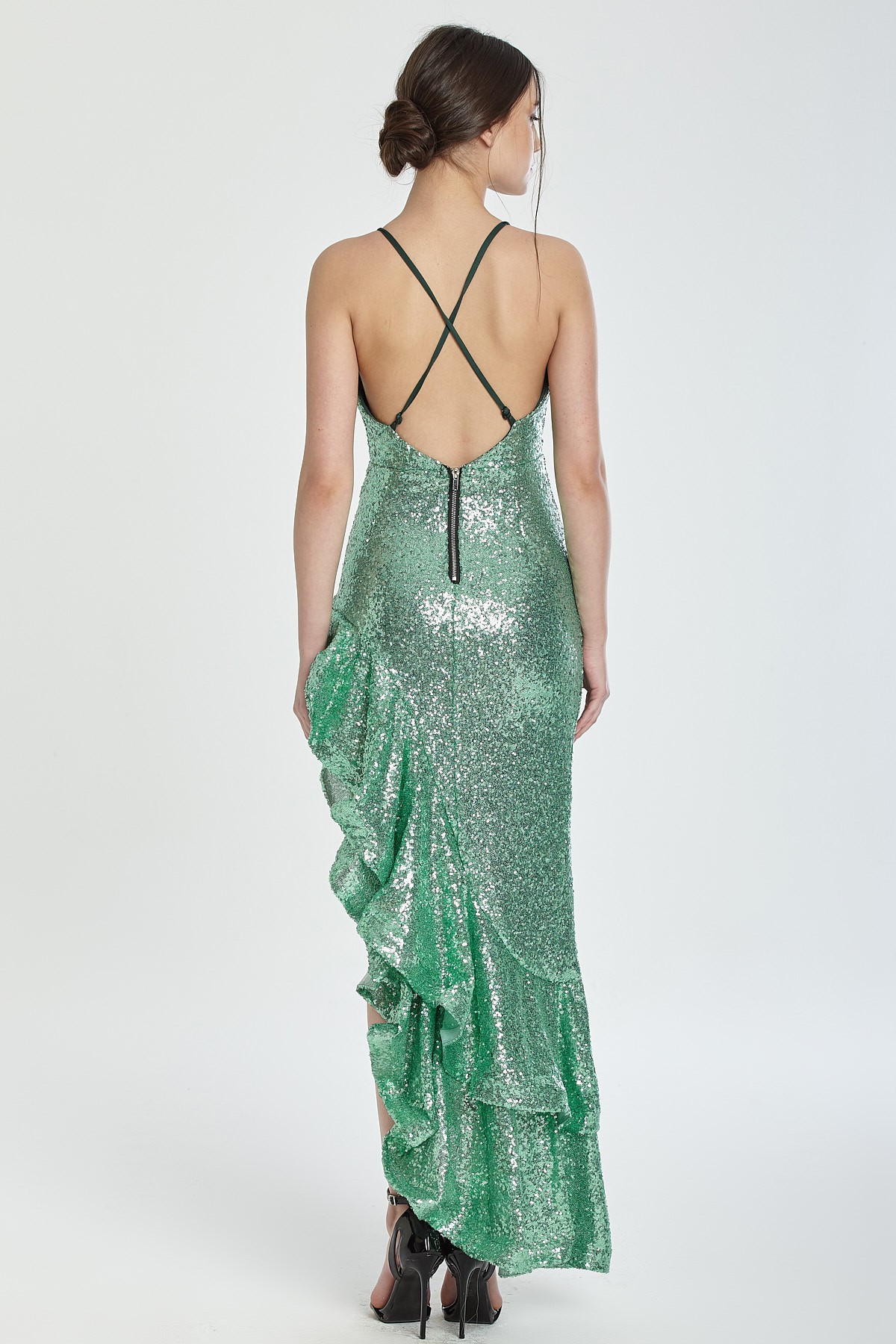 İnce askılı sırtı çarpraz ince askı detaylı derin dekolteli asimetrik kesim etekli etekleri volanlı payetli gece elbisesi