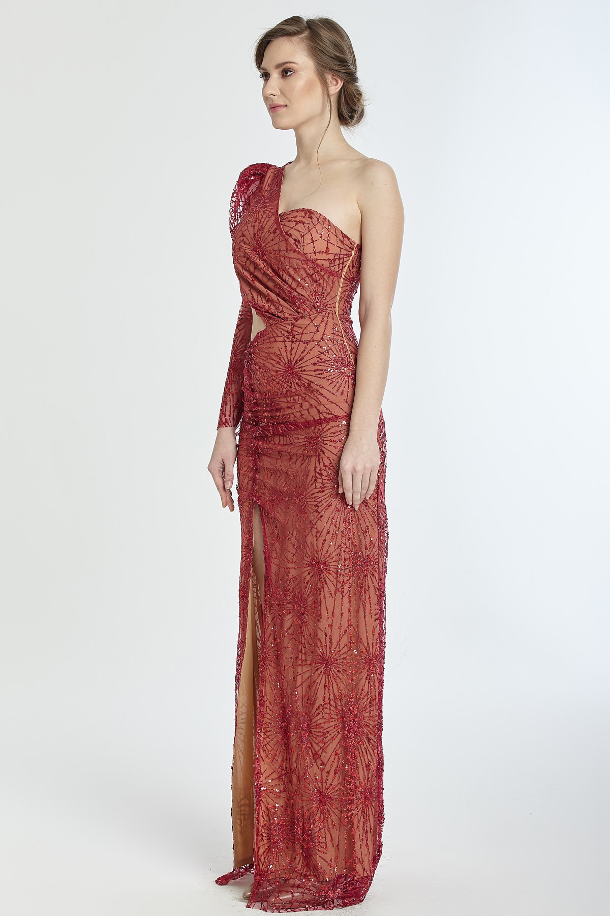 Tek omuz bel dekolteli derin yırtmaçlı kendinden ışıltılı gece elbisesi