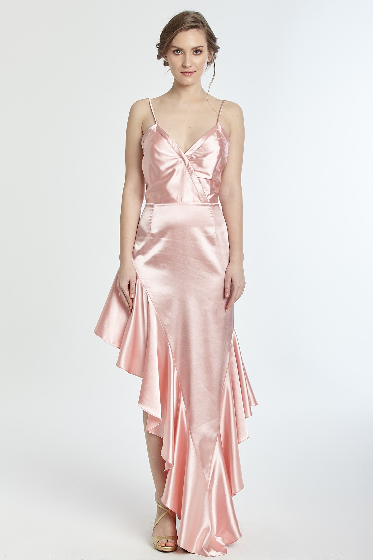 İnce askılı V yaka asimetrik kesim etekleri volanlı saten gece elbisesi