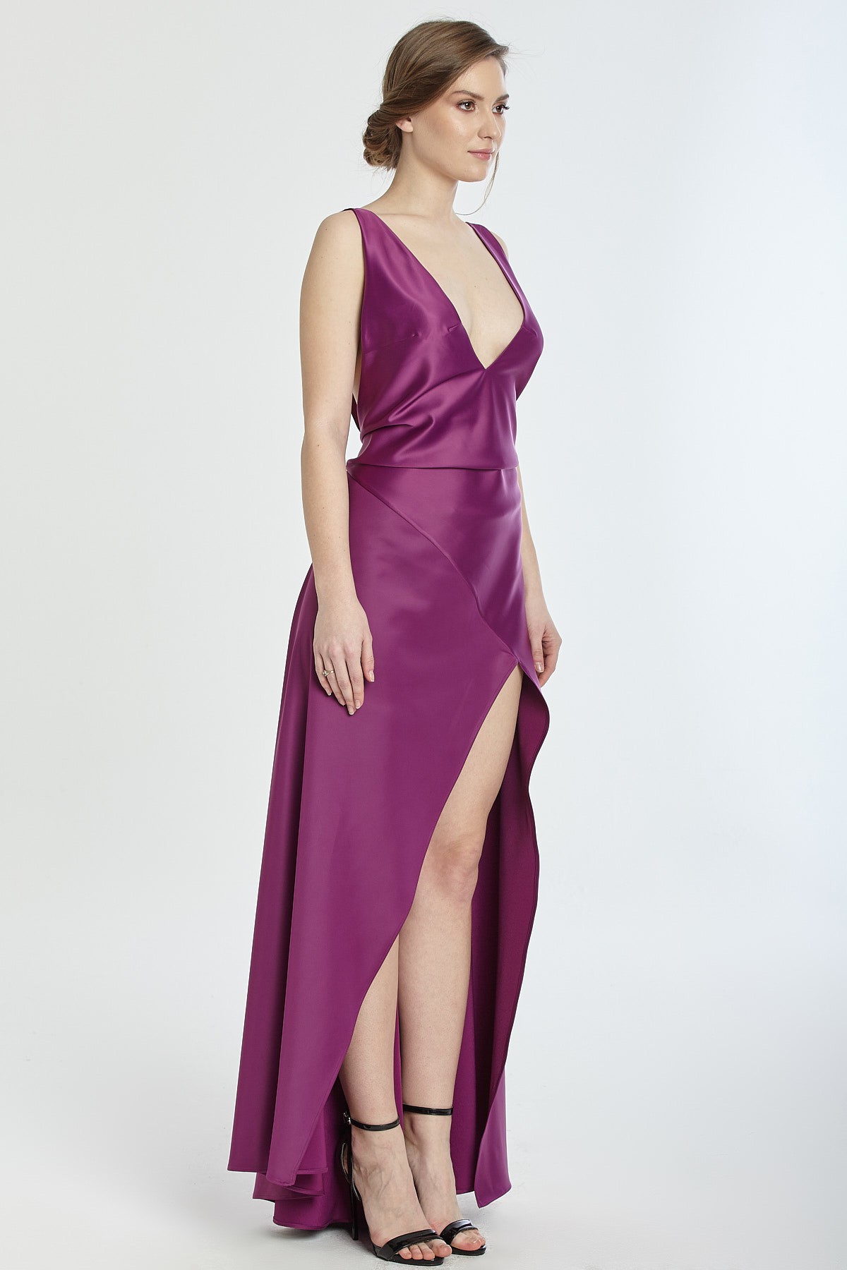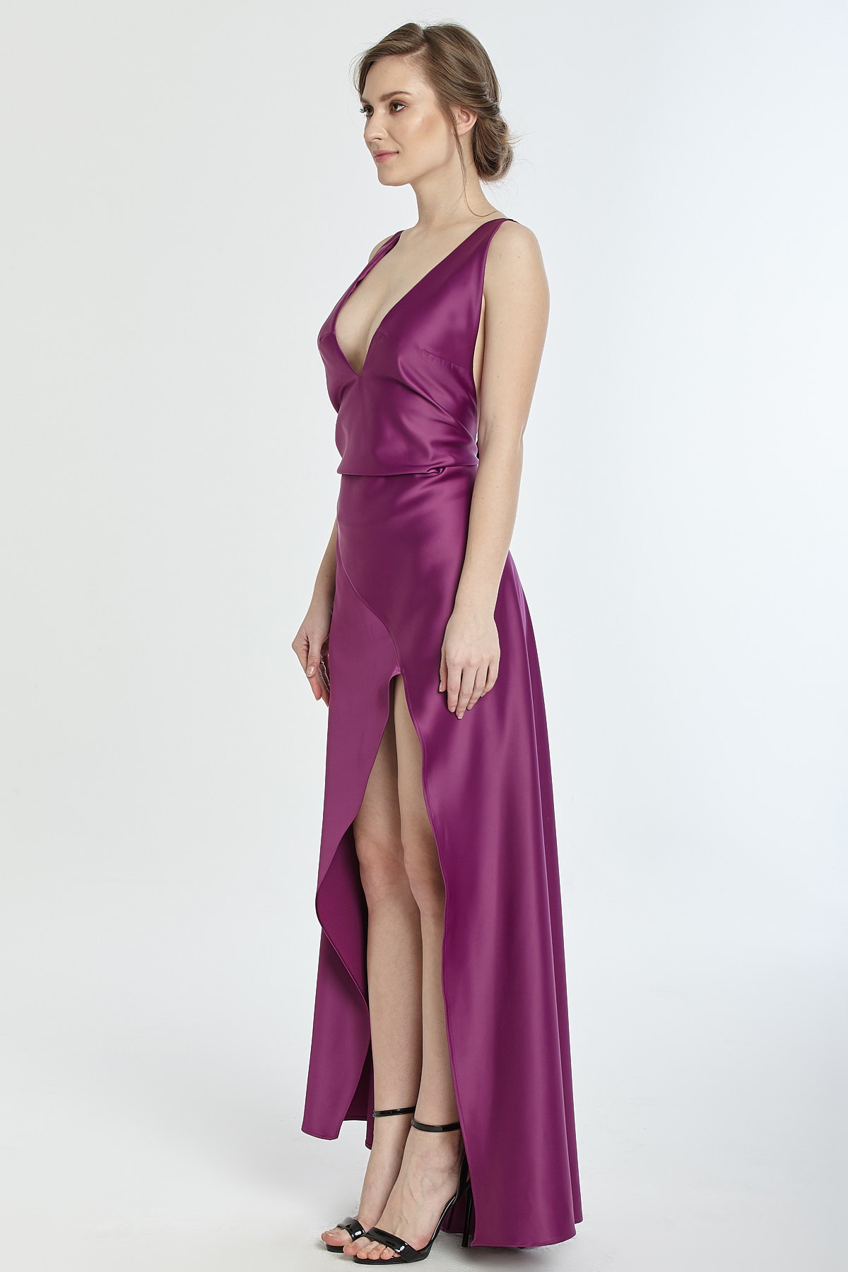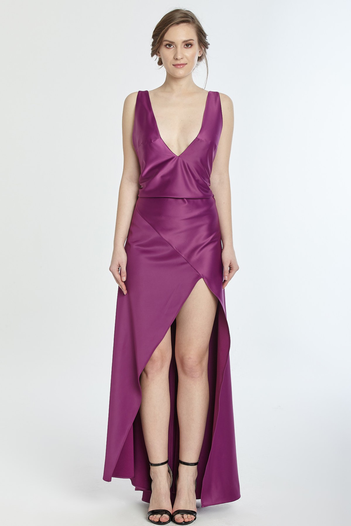 Kalın askılı derin göğüs ve sırt dekolteli asimetrik kesim yırtmaçlı saten gece elbisesi