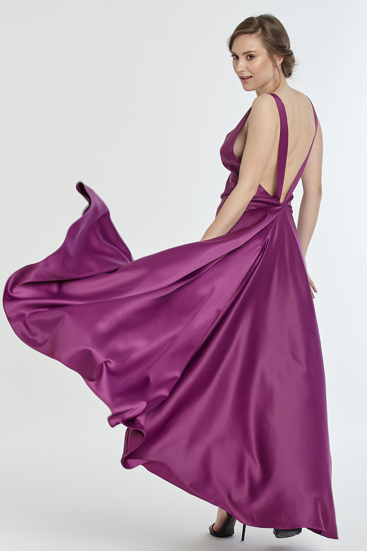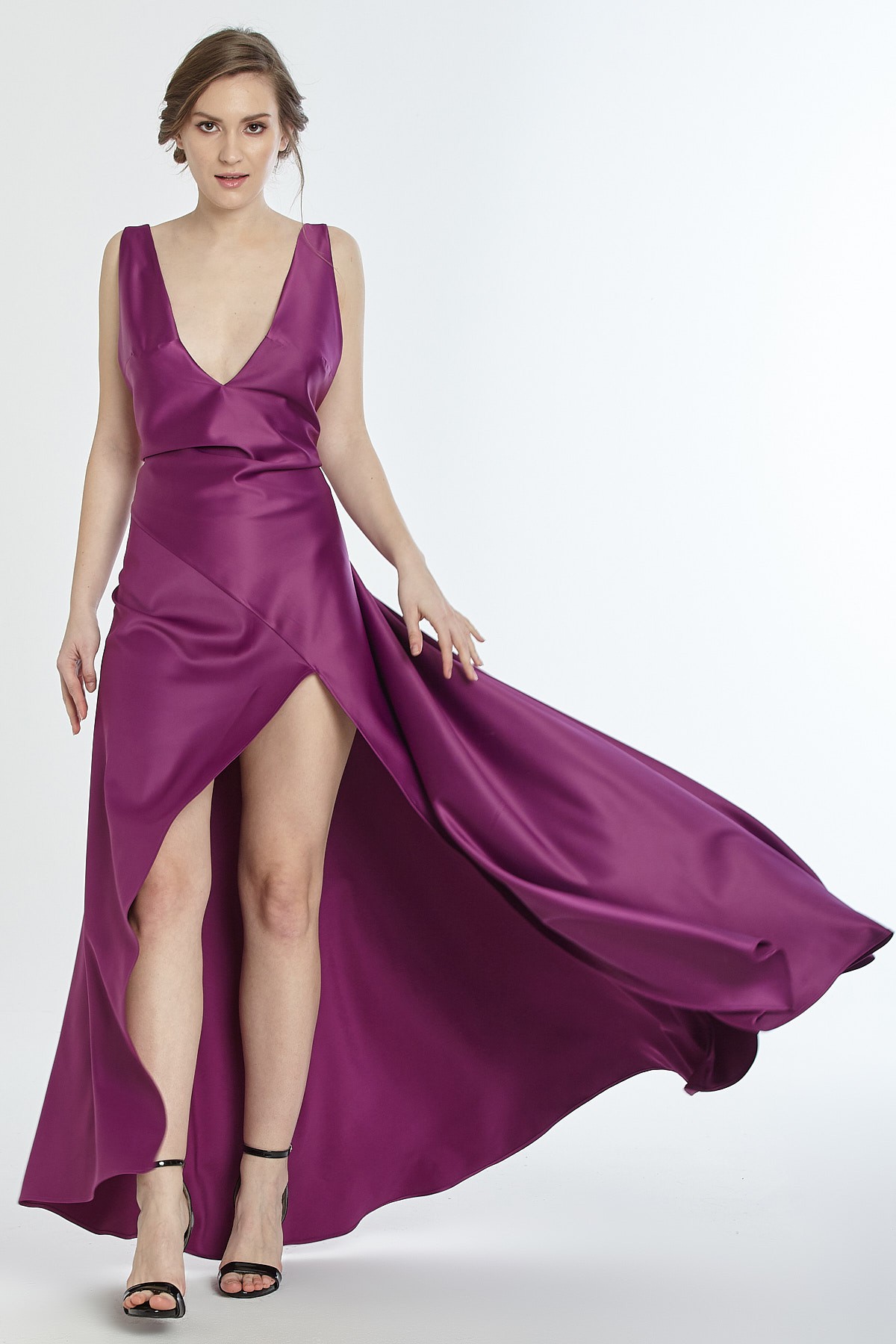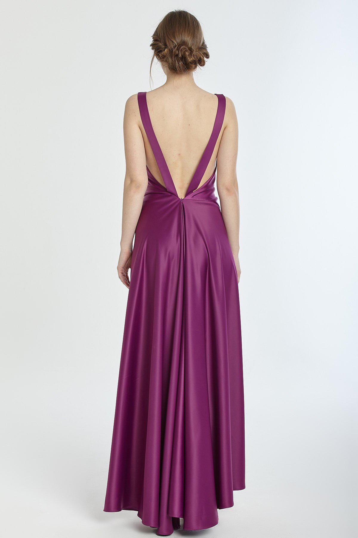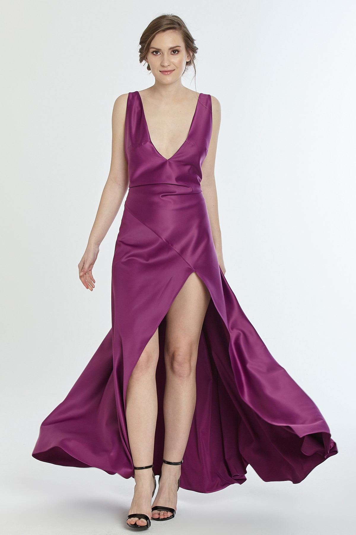 Kalın askılı derin göğüs ve sırt dekolteli asimetrik kesim yırtmaçlı saten gece elbisesi