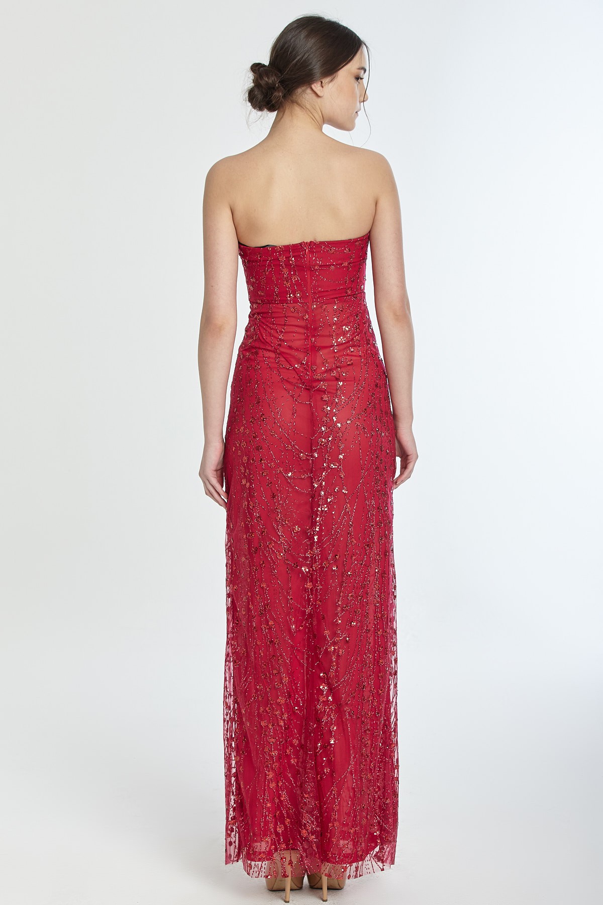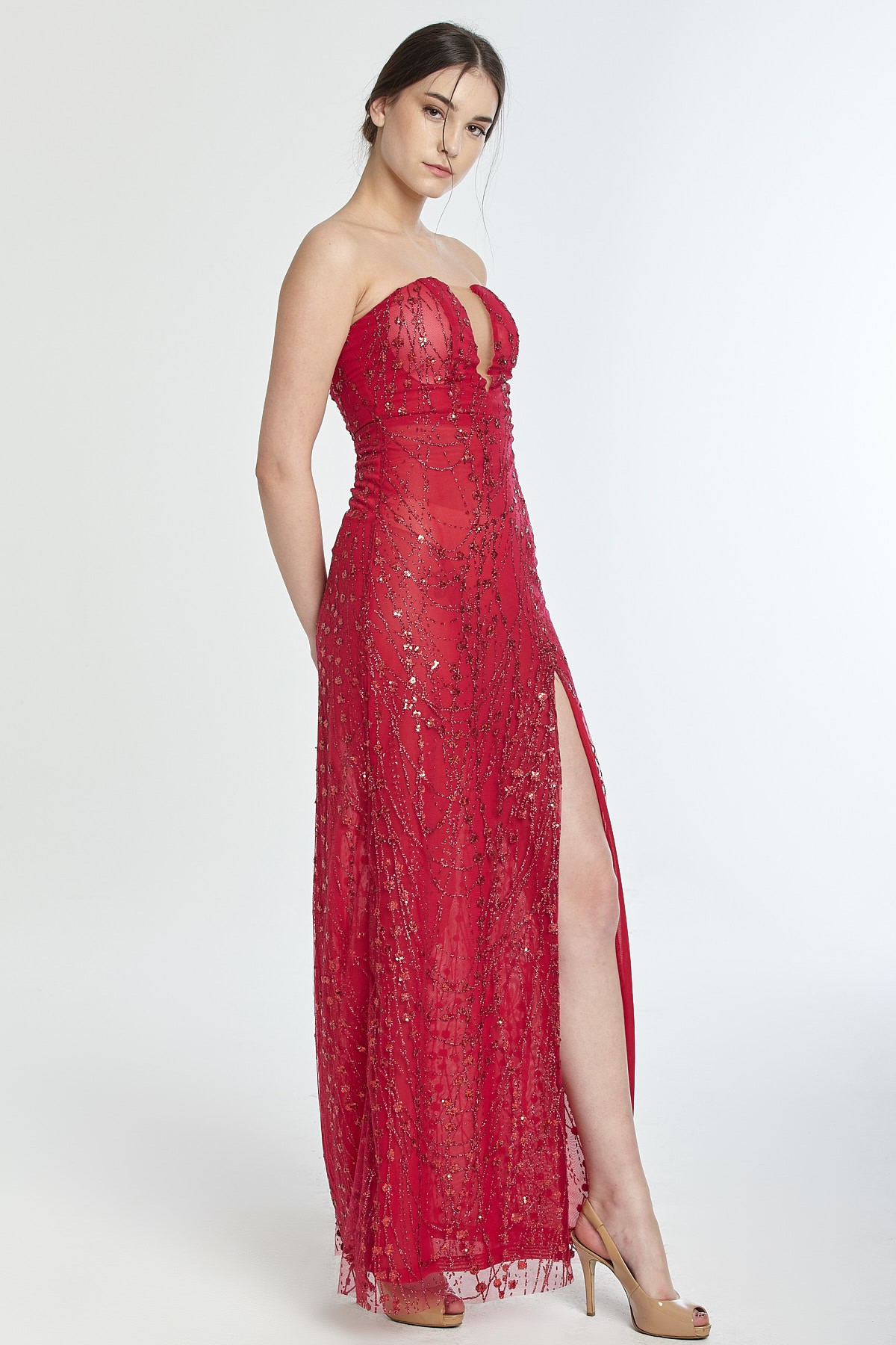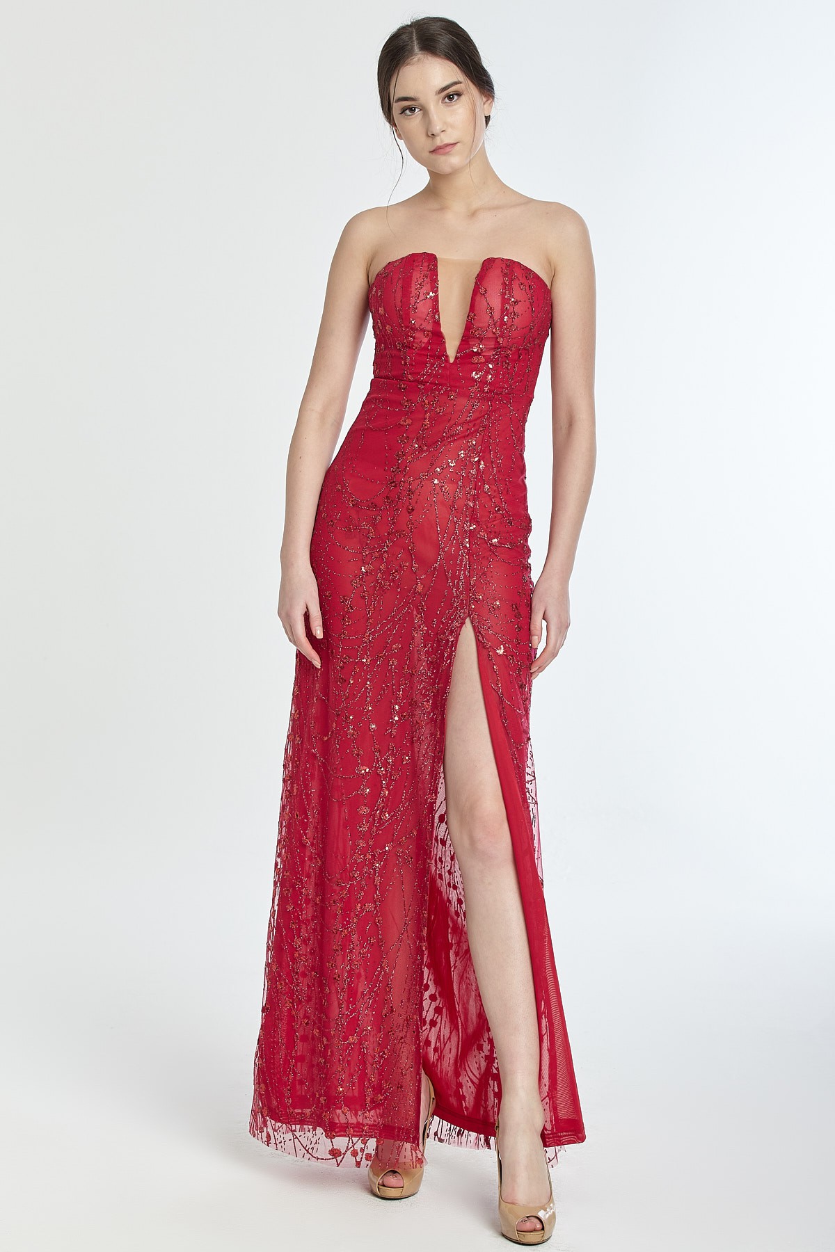 Straplez V dekolteli yırtmaçlı kendinden ışıltılı gece elbisesi