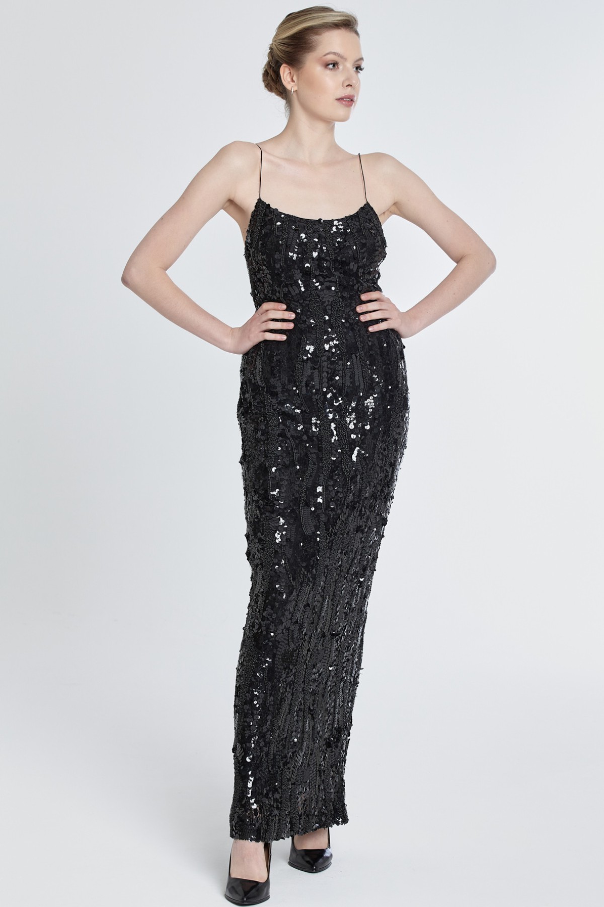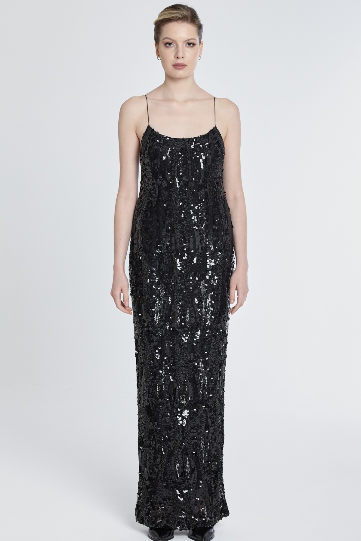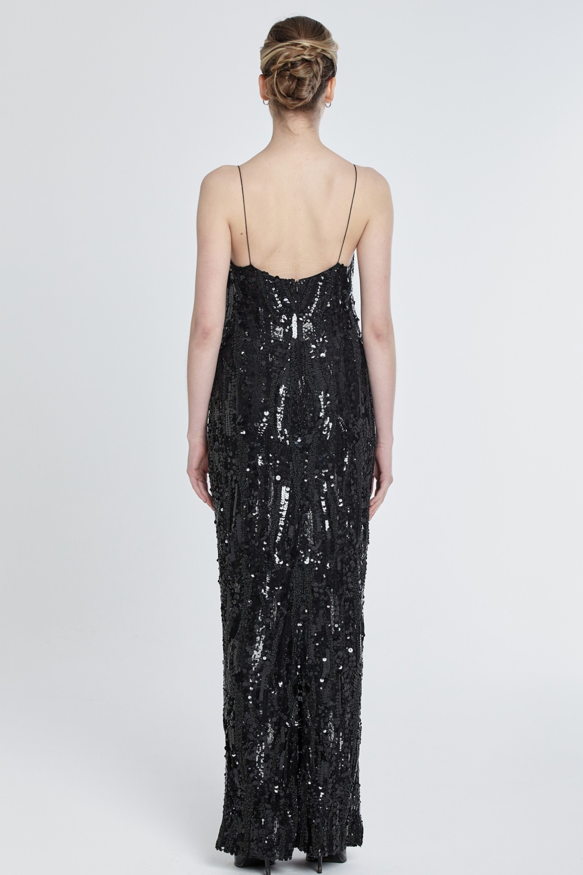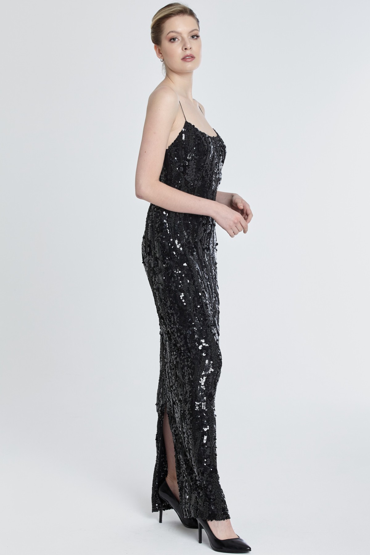 İnce spagetti askılı arkadan yırtmaçlı payetli gece elbisesi