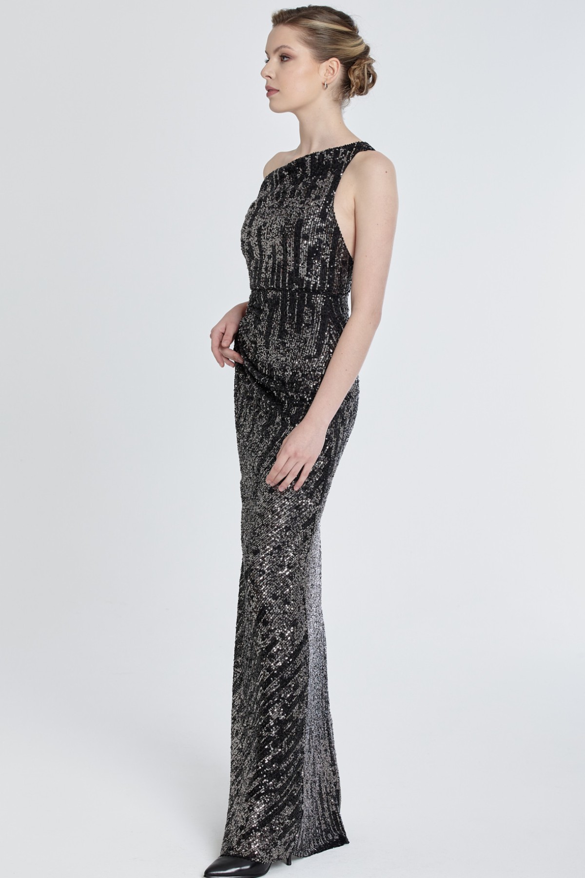 Tek omuz sırtı açık yandan derin yırtmaçlı belinde pencere detaylı uzun gece elbisesi