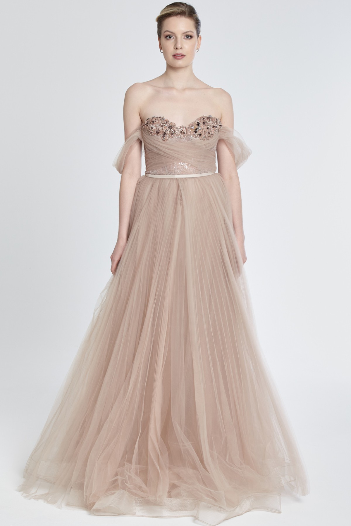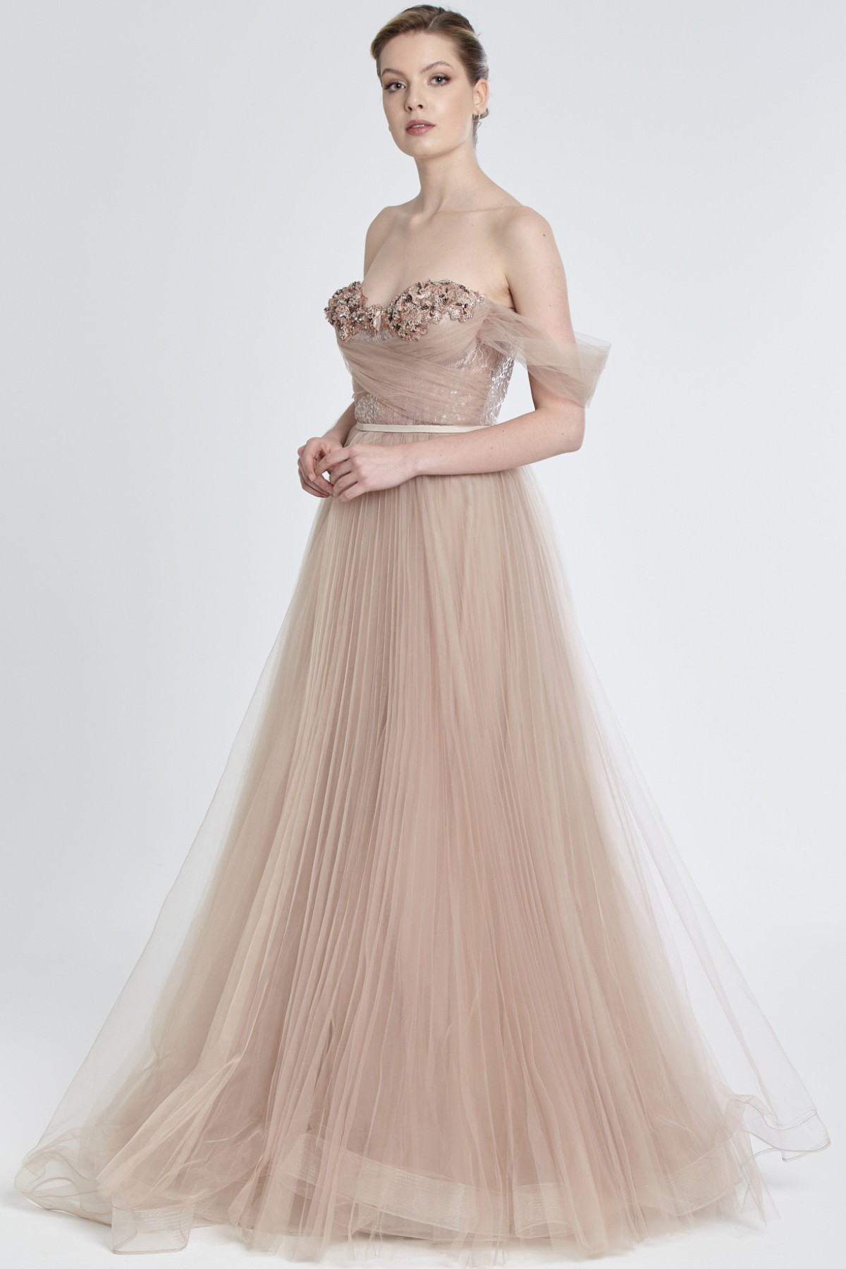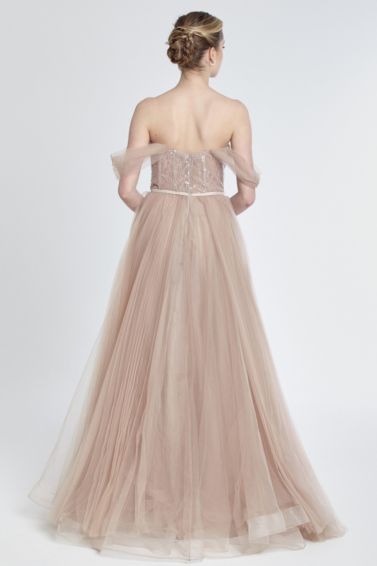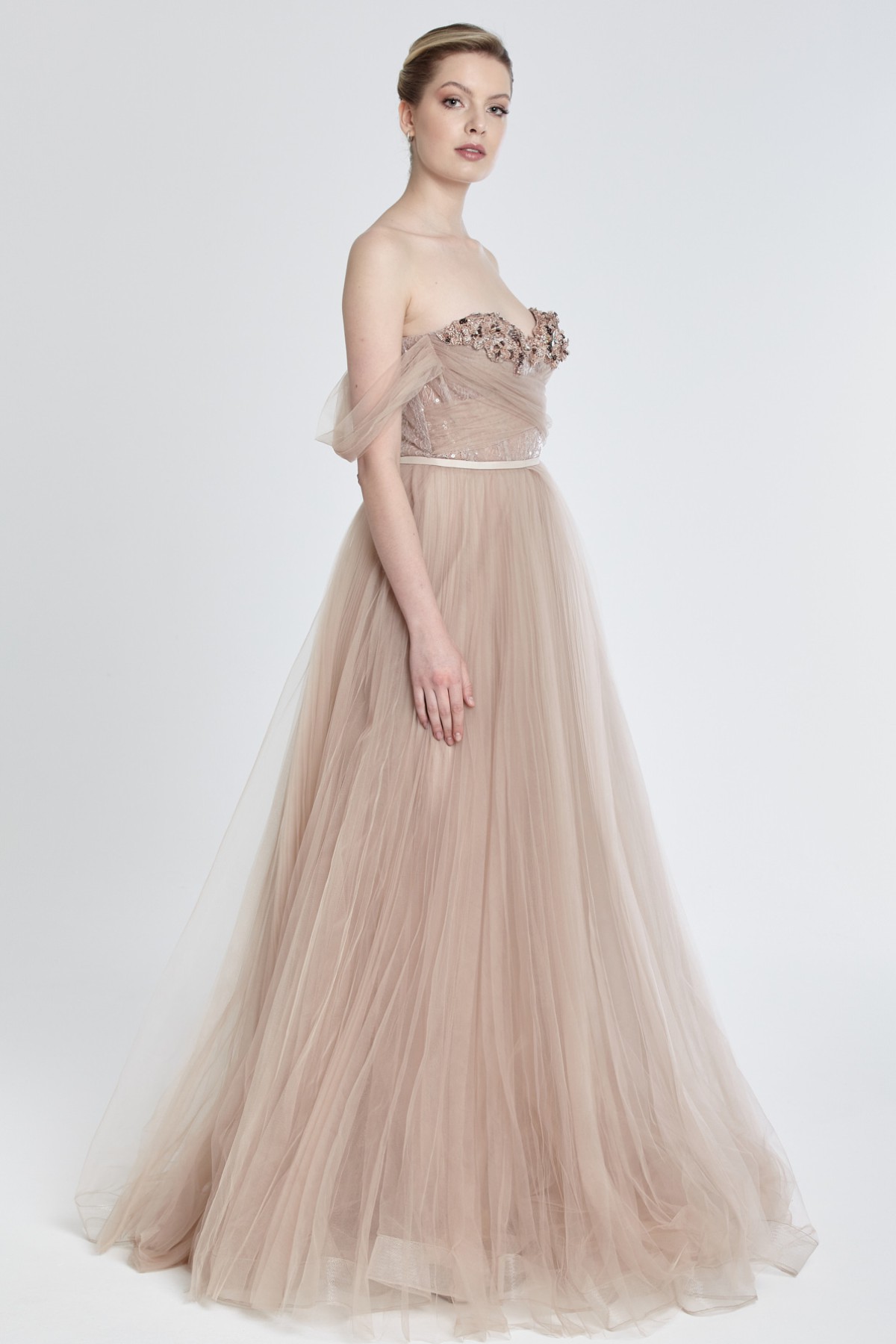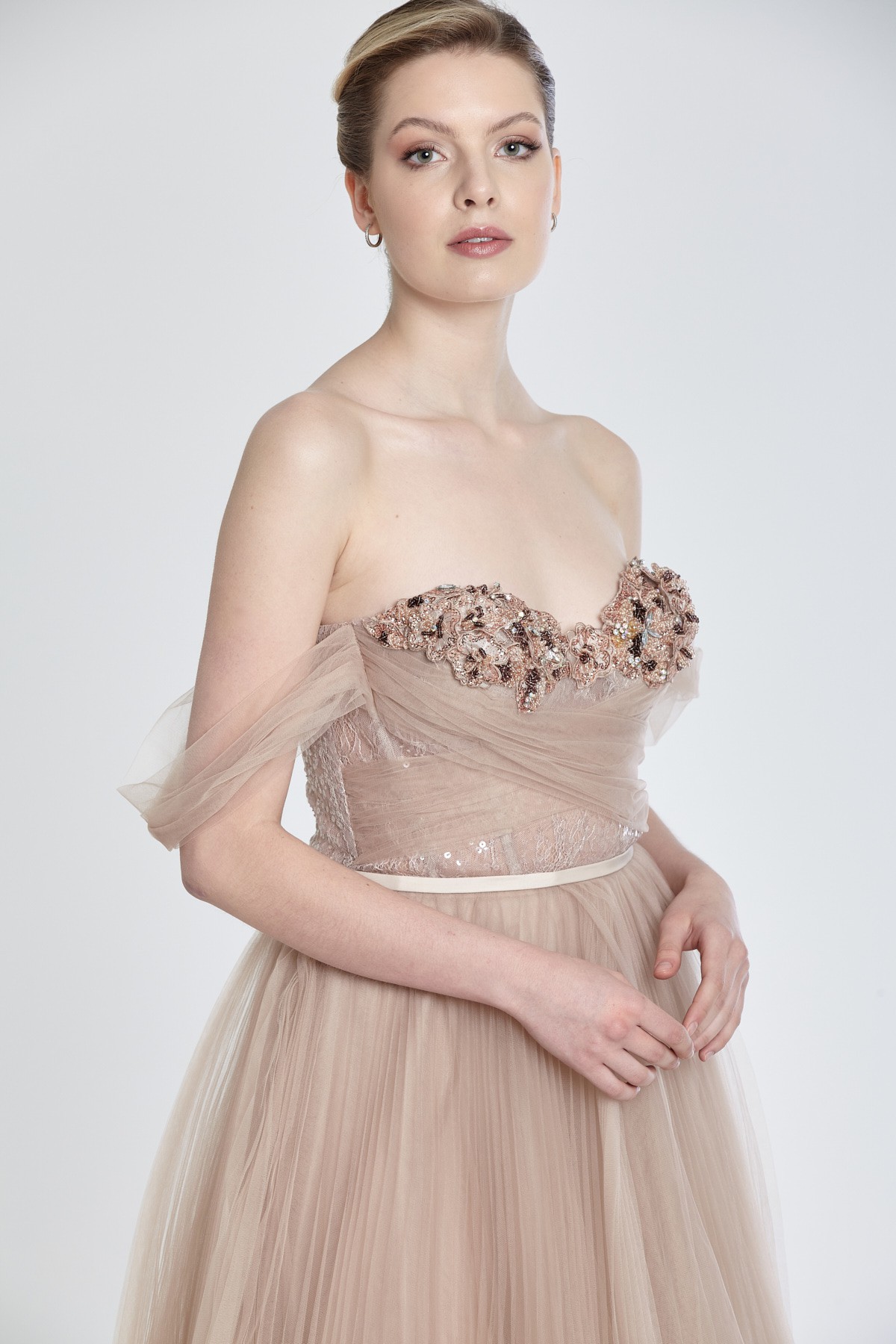 Straplez kolları tül detaylı göğüs boncuk işlemeli kabarık tül gece elbisesi