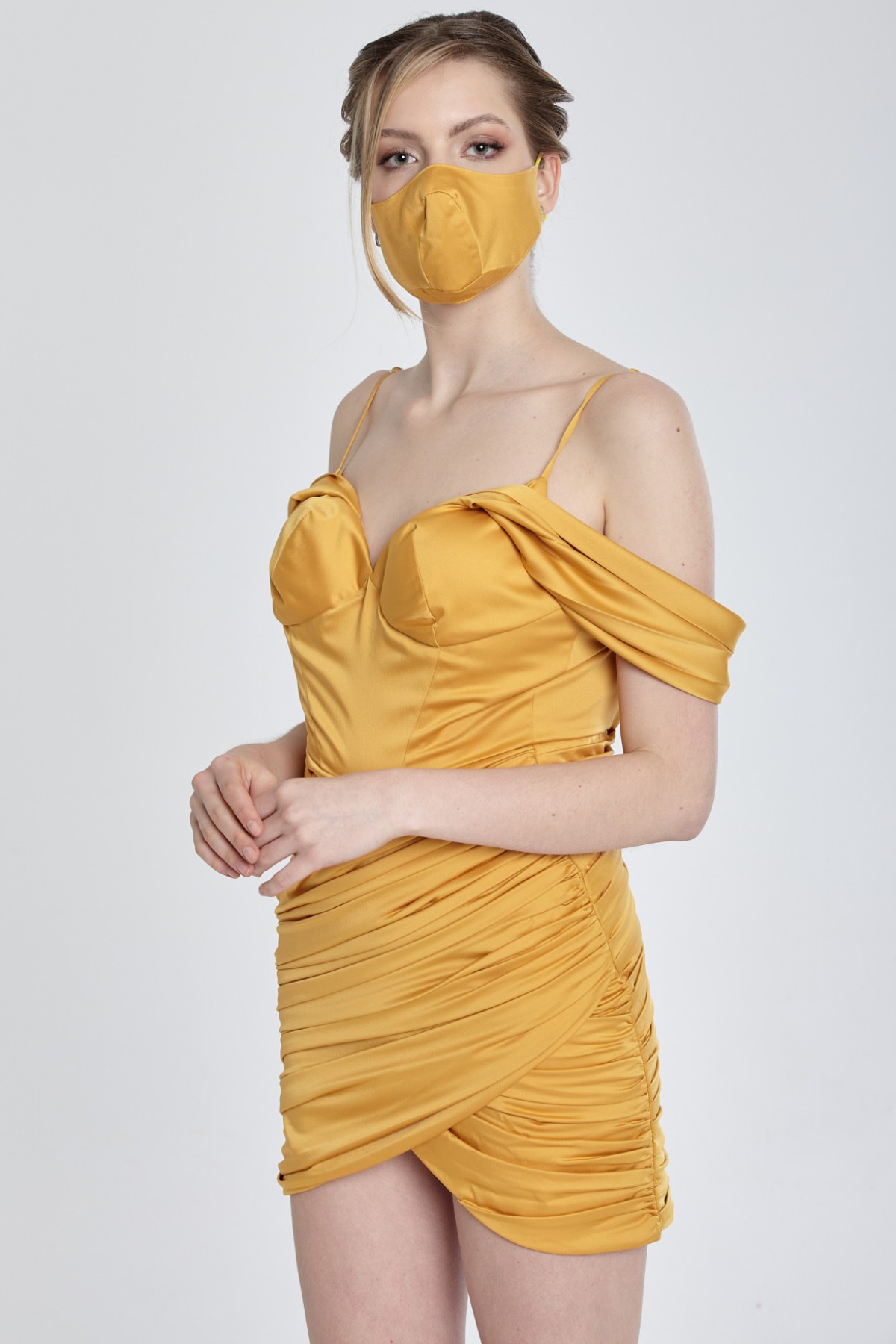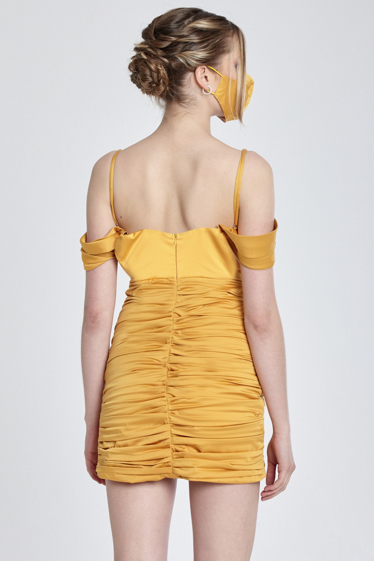İnce askılı drape düşük kol mini kokteyl elbisesi