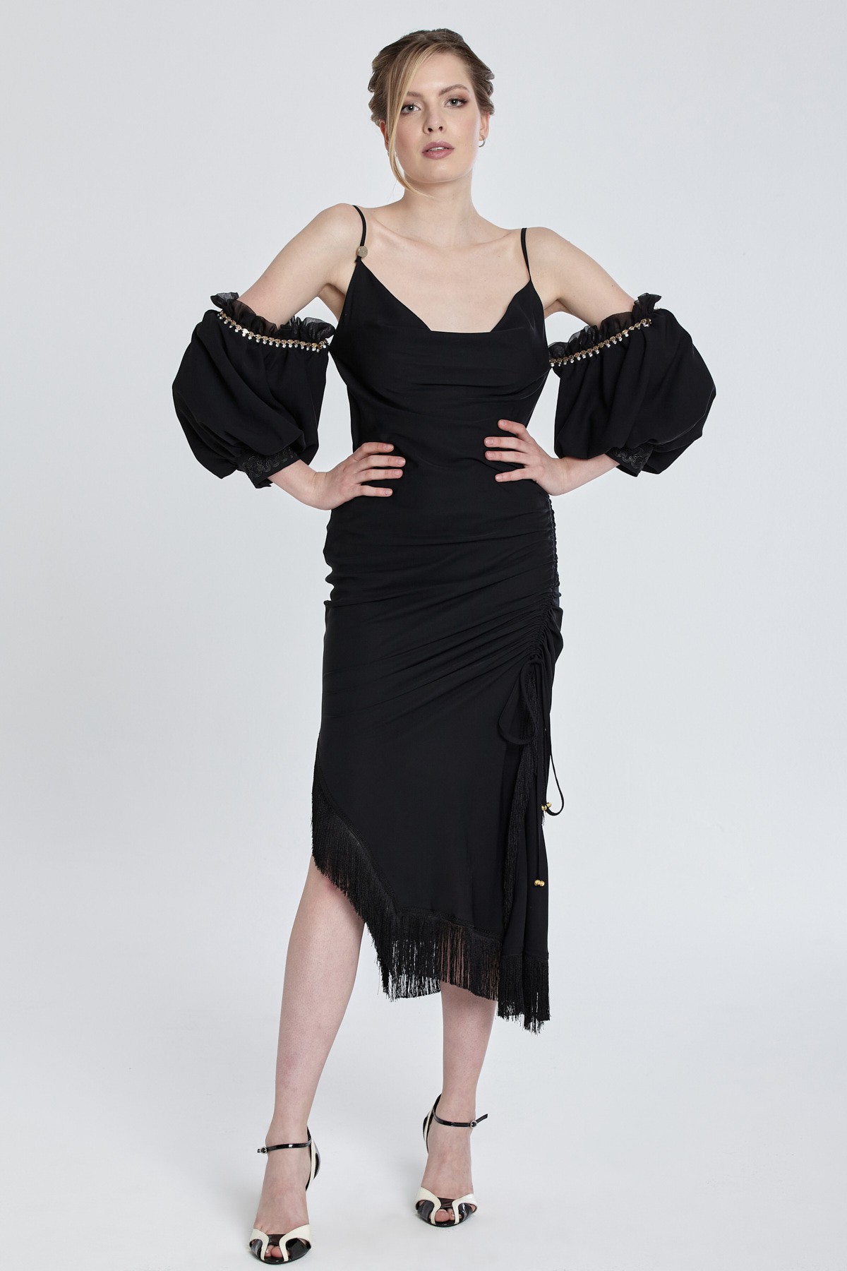 İnce askılı düşük omuz asimetlik kesim etekli etek uçları püskül detaylı midi elbise