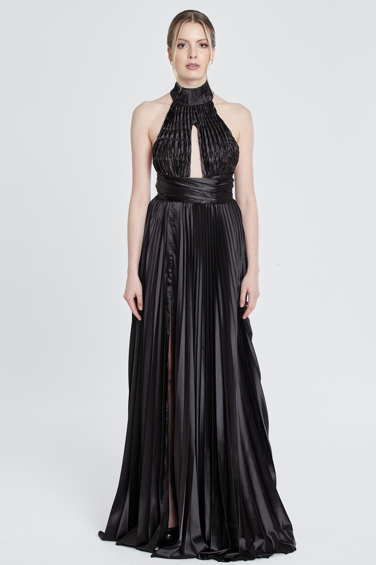 Halter yaka göğüs ve sırt dekolteli beli kemerli etekleri pileli yırtmaçlı saten gece elbisesi