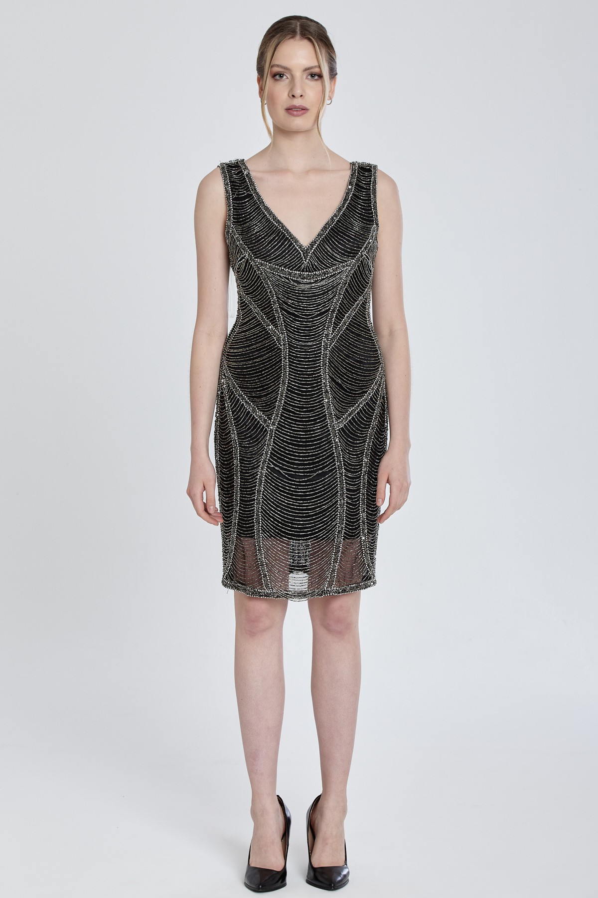 Kalın askılı boncuk işlemeli V yaka sırt dekolteli mni elbise