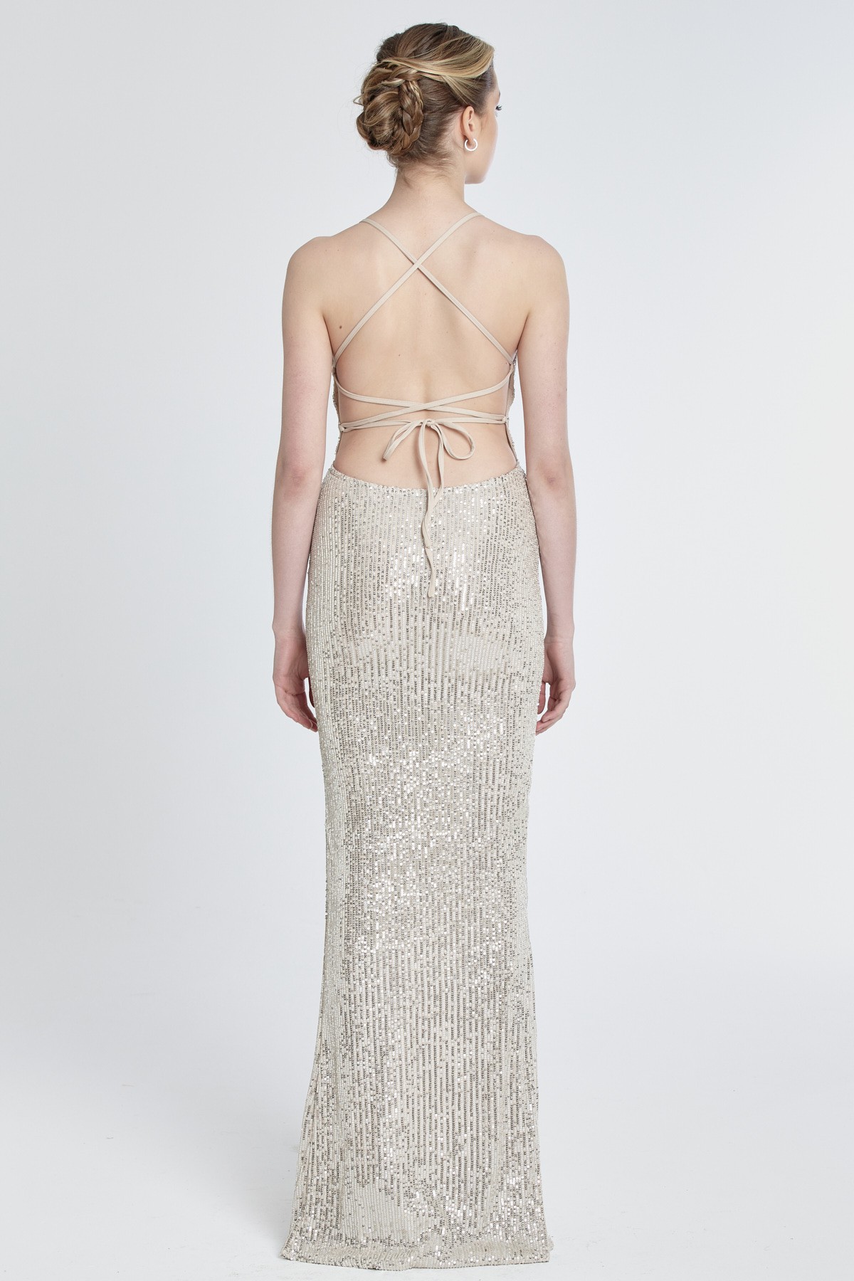 İnce askılı V yaka sırtı çarpraz dekoteli derin yırtmaçlı payetli gece elbisesi