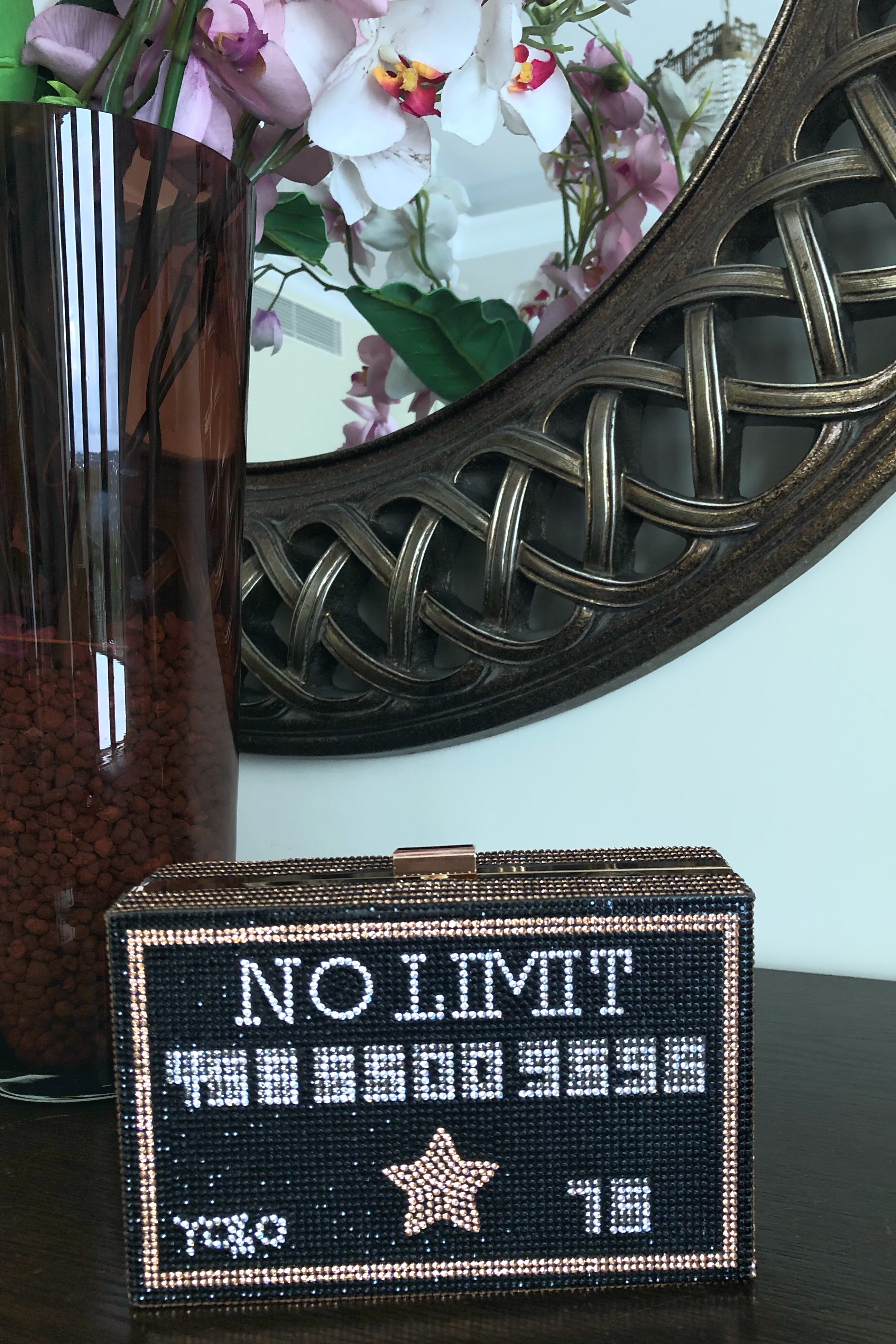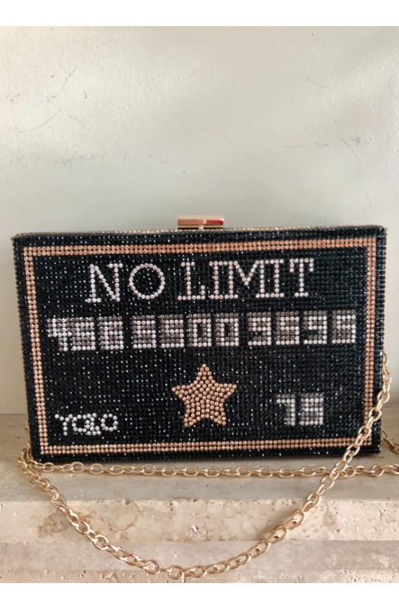 Kristal taş kaplı siyah kredi kartı görünümünde ince zincir askı ile de kullanılabilen kutu gece çantası.