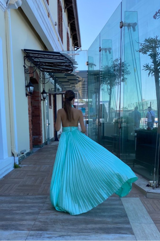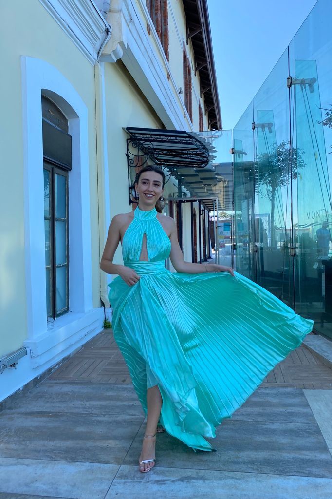 Halter yaka beli kemerli etekleri pileli sırtı açık yandan derin yırtmaçlı saten gece elbisesi