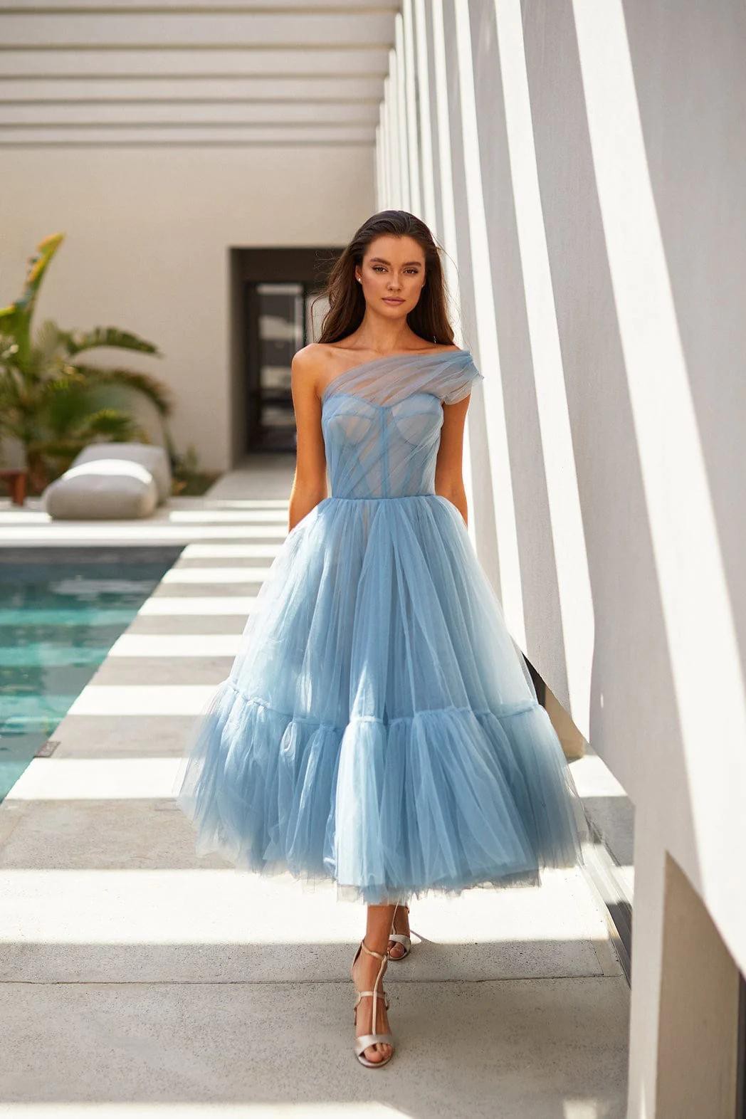 Tek omuz üst kısmı ve A kesim midi elbise açık mavi tül kumaştan üretilmiştir. Elbisenin kısa açık ten rengi jüponlu kabarık midi eteği mevcuttur . Yarı transparan korse arkadan fermuarlıdır. Kalp şeklindeki yaka, asimetrik şeffaf bir kolla kaplıdır.