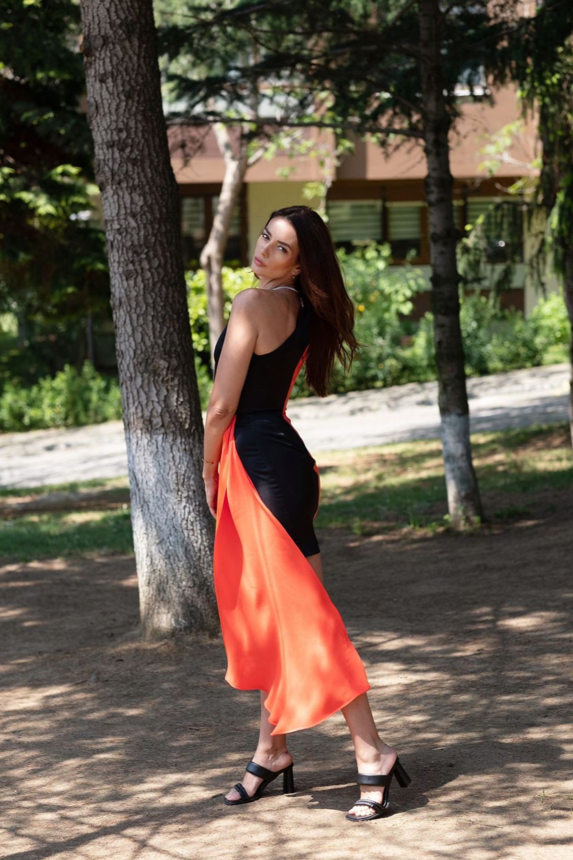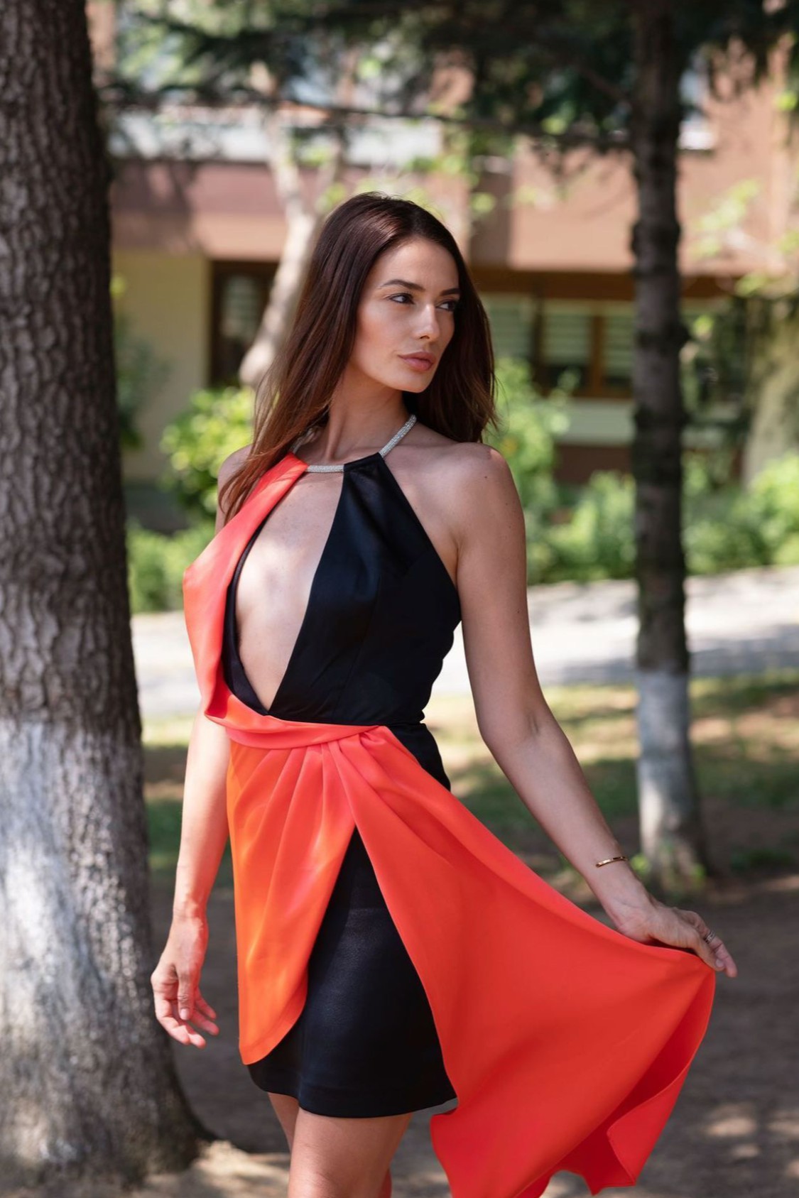 Çarpıcı göğüs dekoltesi, yırtmaç detayı ve boyundaki zarif aksesuarıyla size zarif bir silüet sunan bu elbiseyi kiraladığınızda kendinizi şımartın ve partinin ya da kokteylin keyfine varın. Cesur ve çarpıcı tarzınızı ışıltılı bileklikler topuklu sandaletlerle tamamlayın. Hem siyahın hem de göz alıcı nar çiçeği renginin teninizde yaratacağı kontrast sizi ışıldatacak.