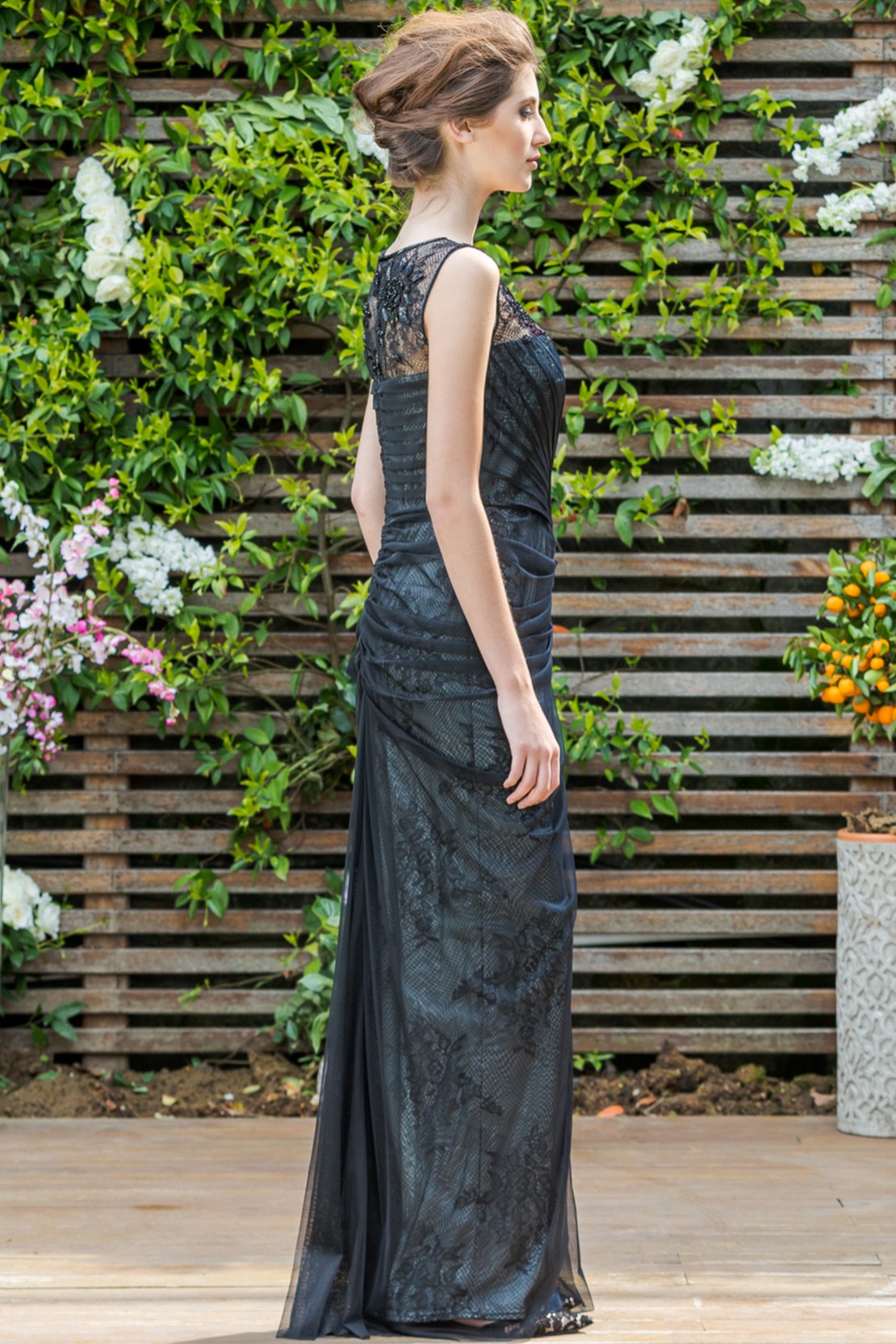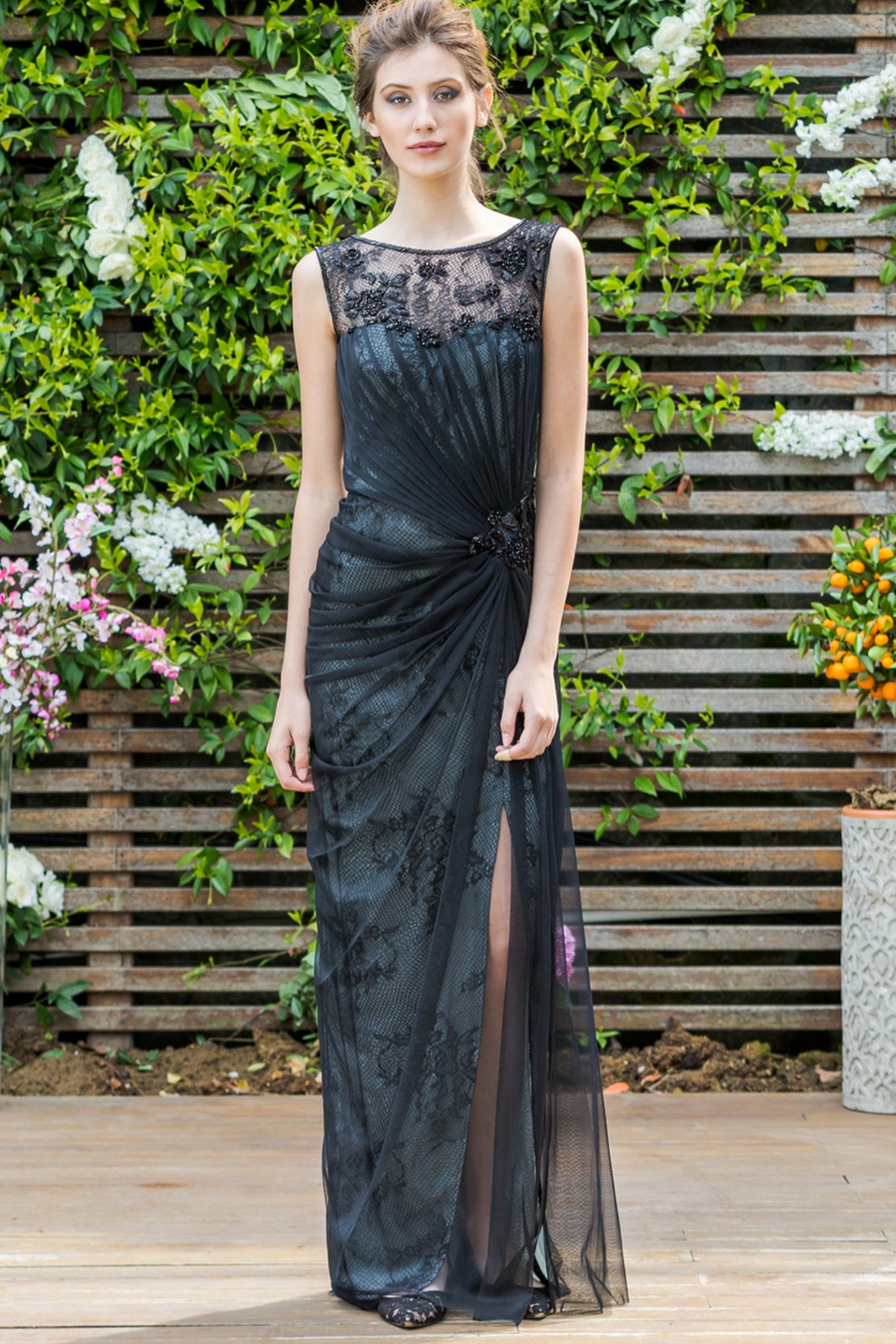 Göğsü Dantel İşlemeli Beli Drapeli Önden Yırtmaçlı Gece Elbisesi