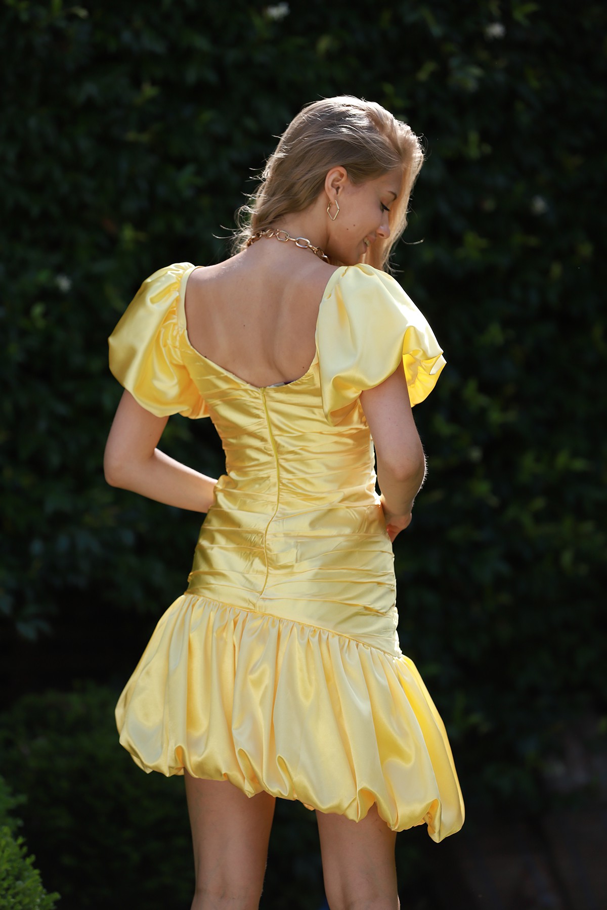 Kalp yaka kolları volanlı drapeli etek kısmı asimetrik balonlu saten mini elbise