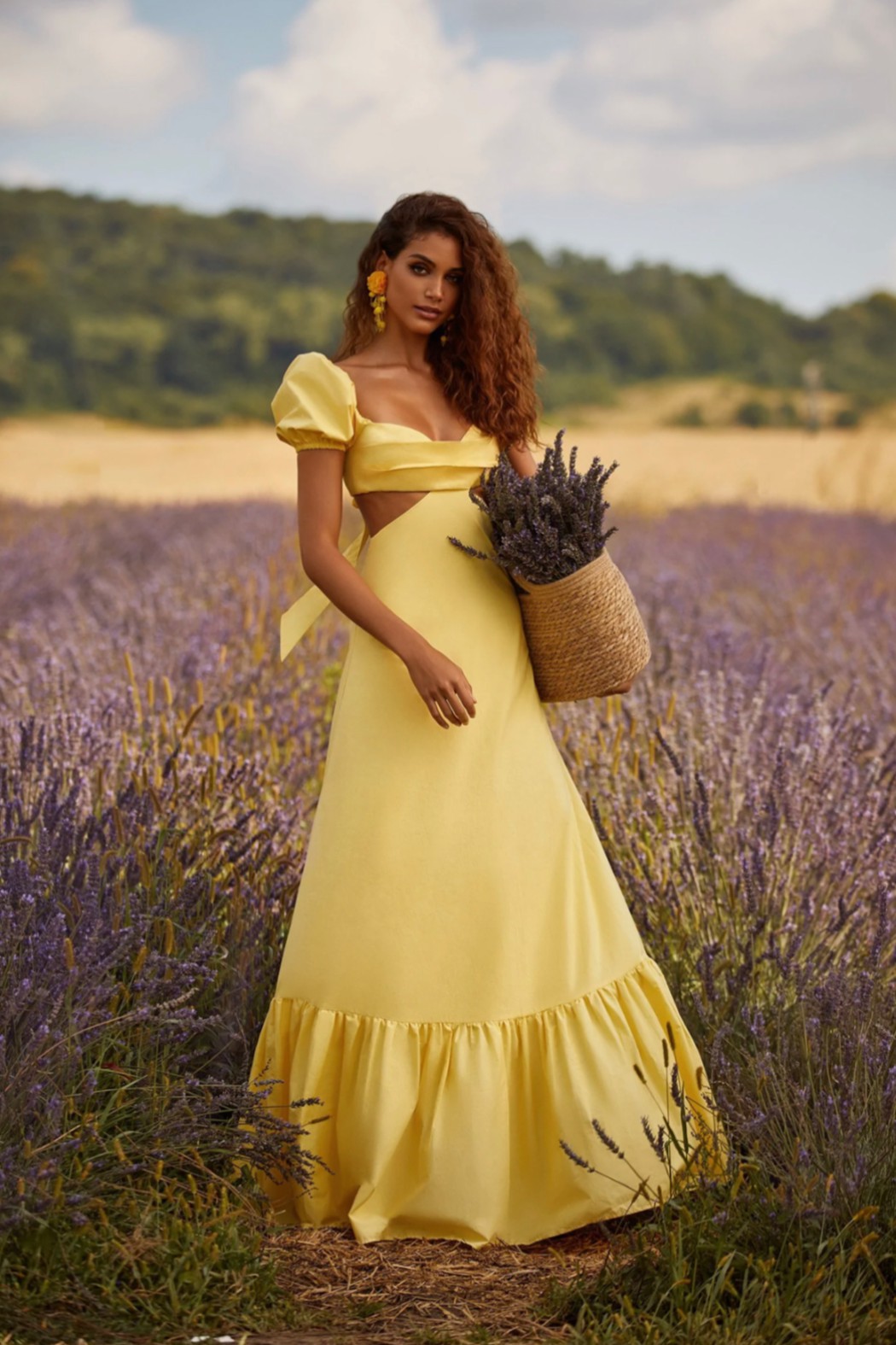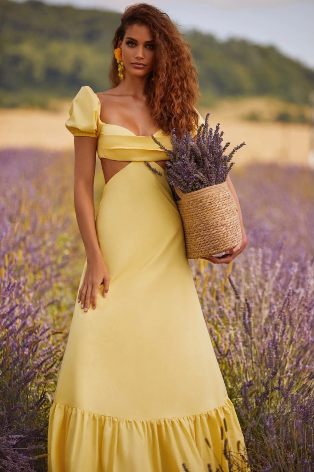 Zahmetsiz yaz stilinizi Kasia elbisemizle yansıtın. Kasia Elbise, kıvrık pileli, yanları oyuklu ve arka papyonlu bir büstiye sahiptir. A kesim silüeti ve kabarık kollu bu poplin maksi elbise, parlak sarı tonuyla tüm dikkatleri üzerine çekiyor.