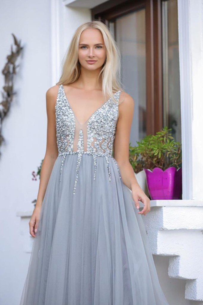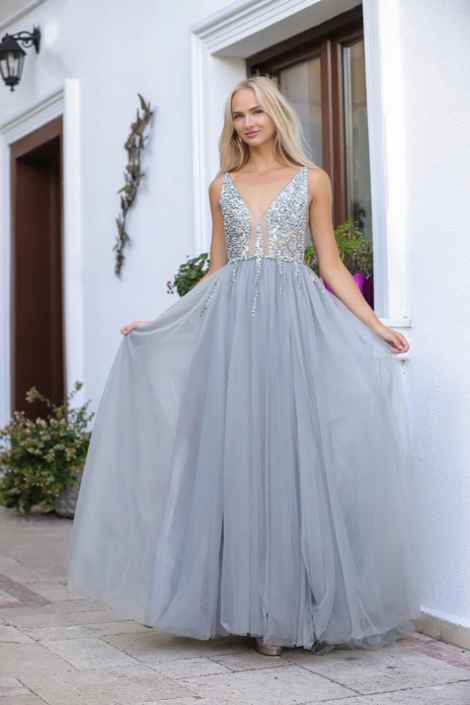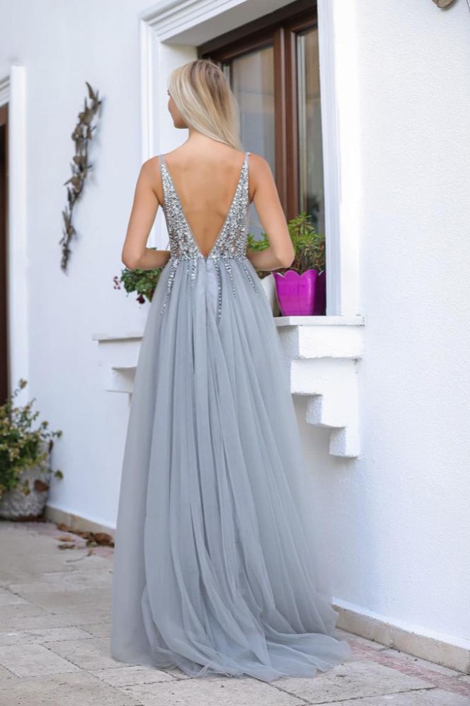 Derin V yaka sırtı açık göğüs ve sırt kısmı boncuk ve payet işlemeli çift yırtmaçlı tül gece elbisesi