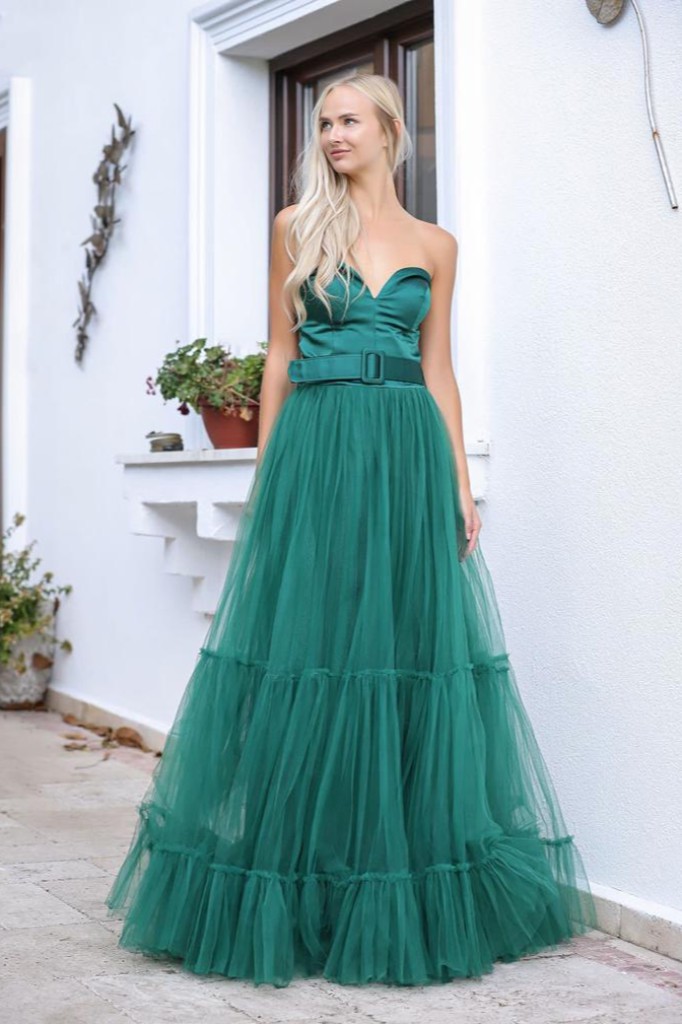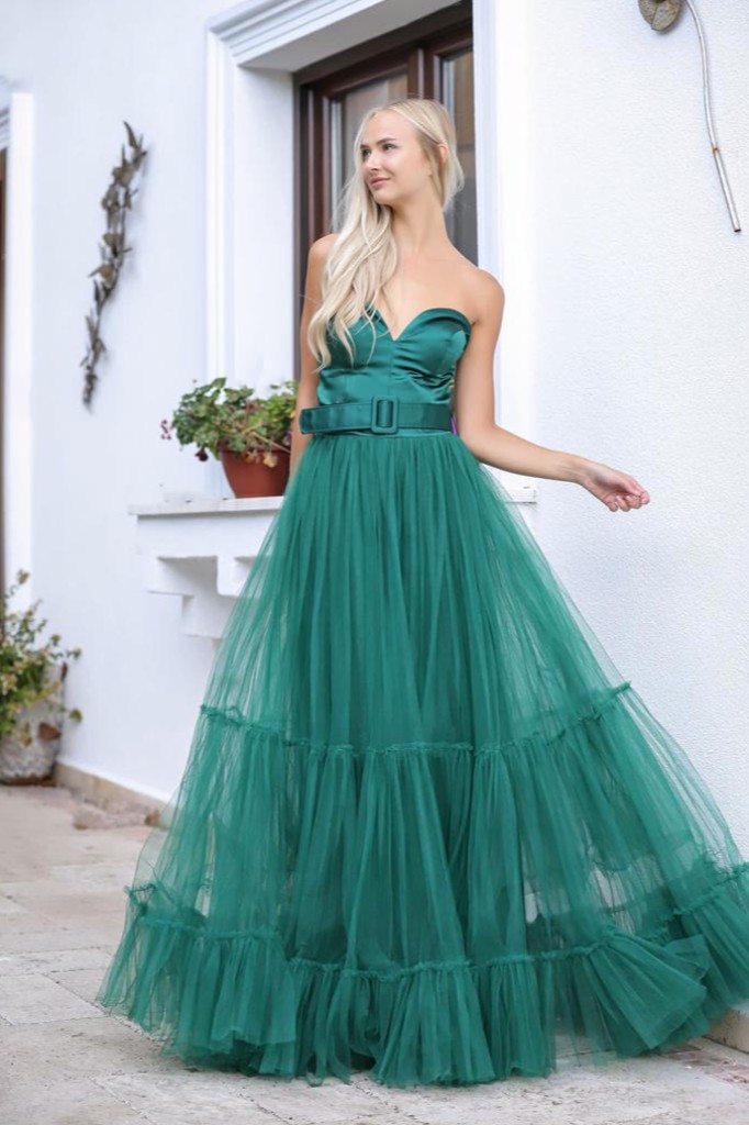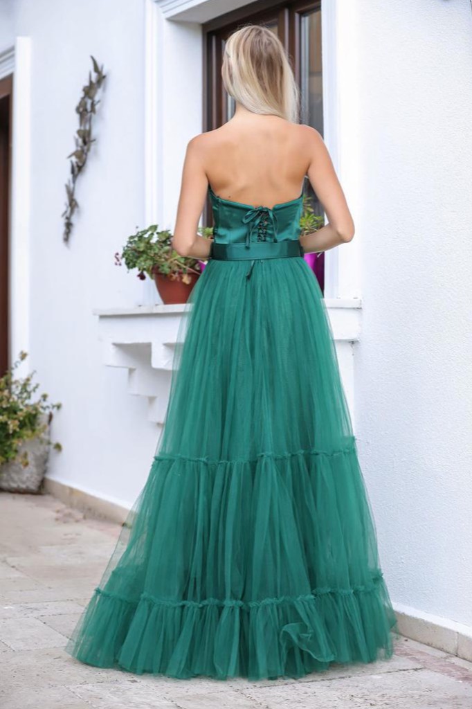 Straplez üst kısmı saten beli kemerli sırtı bağlamalı kabarık tül gece elbisesi