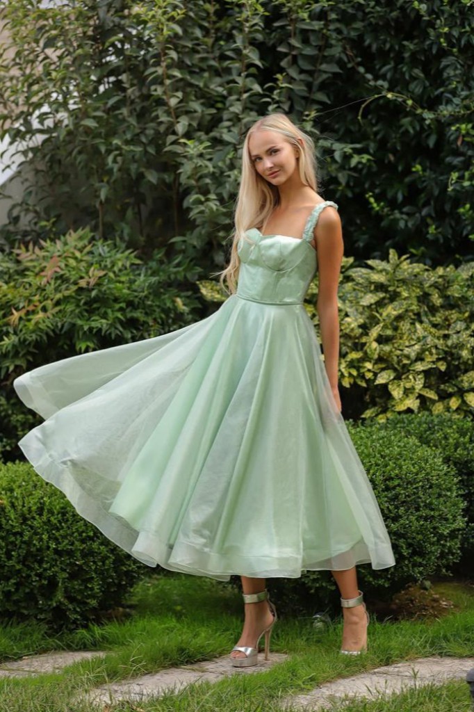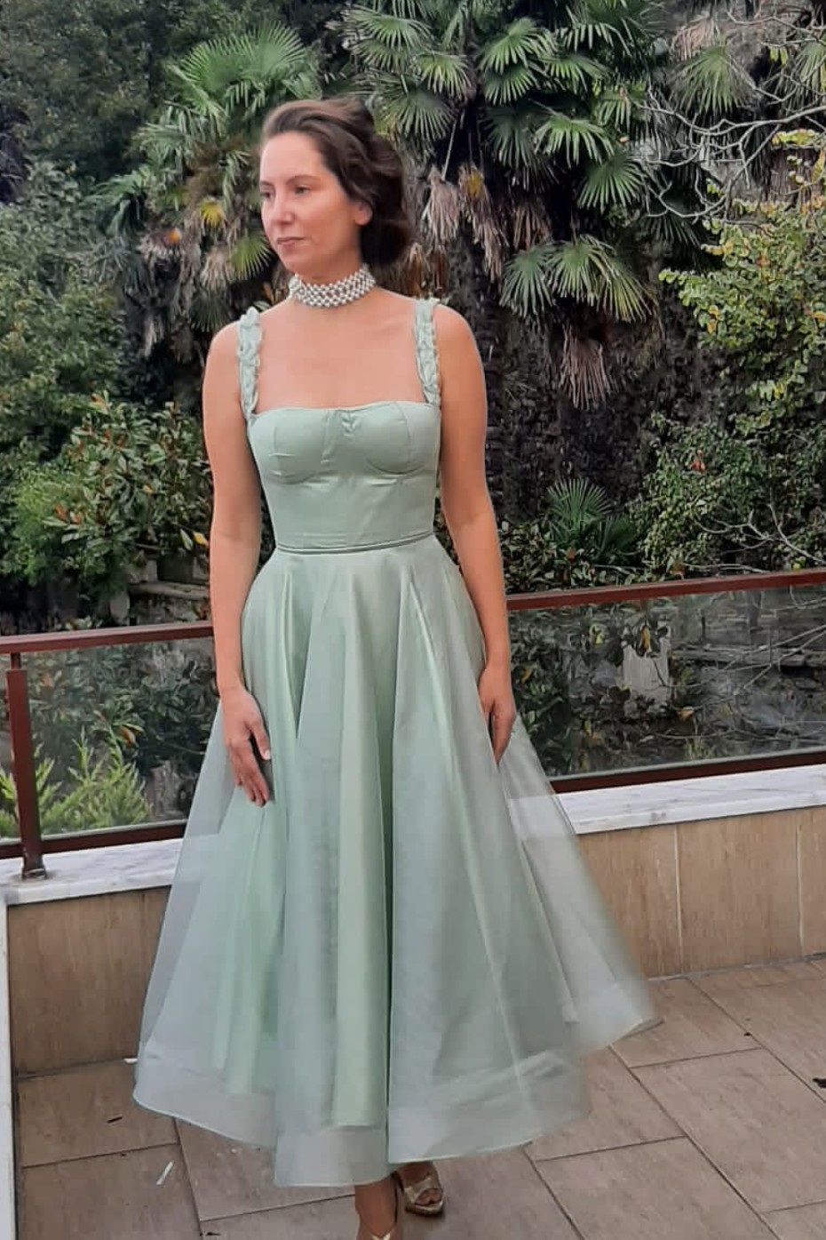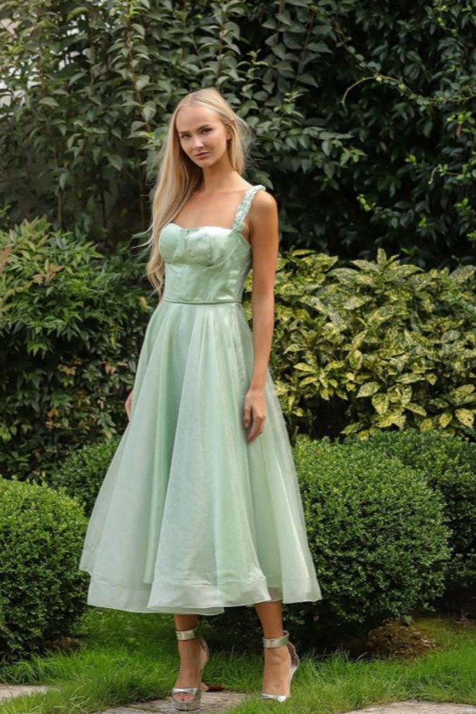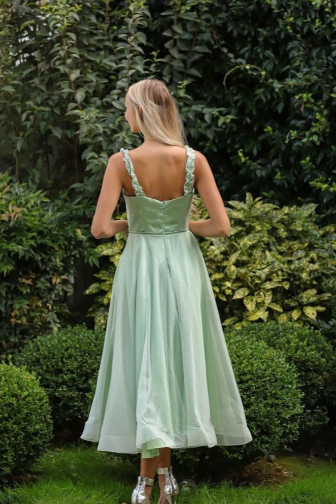 Kalın fırfırlı askılı göğüs kuplu midi boy tül elbise