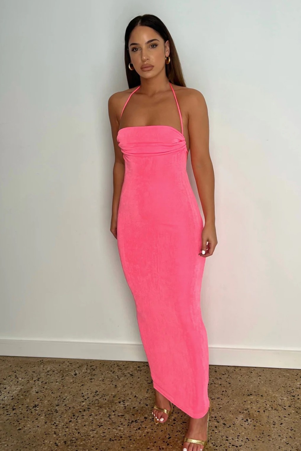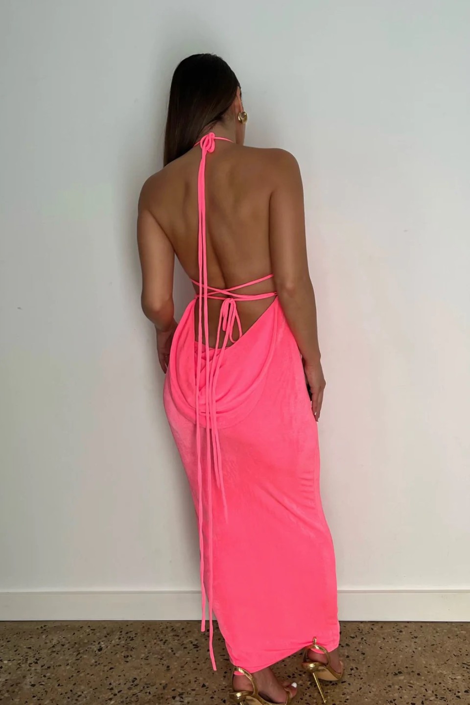 Göğüs drapeli sırtı açık dökümlü uzun bağcıklı bilek boy nekn pembe elbise