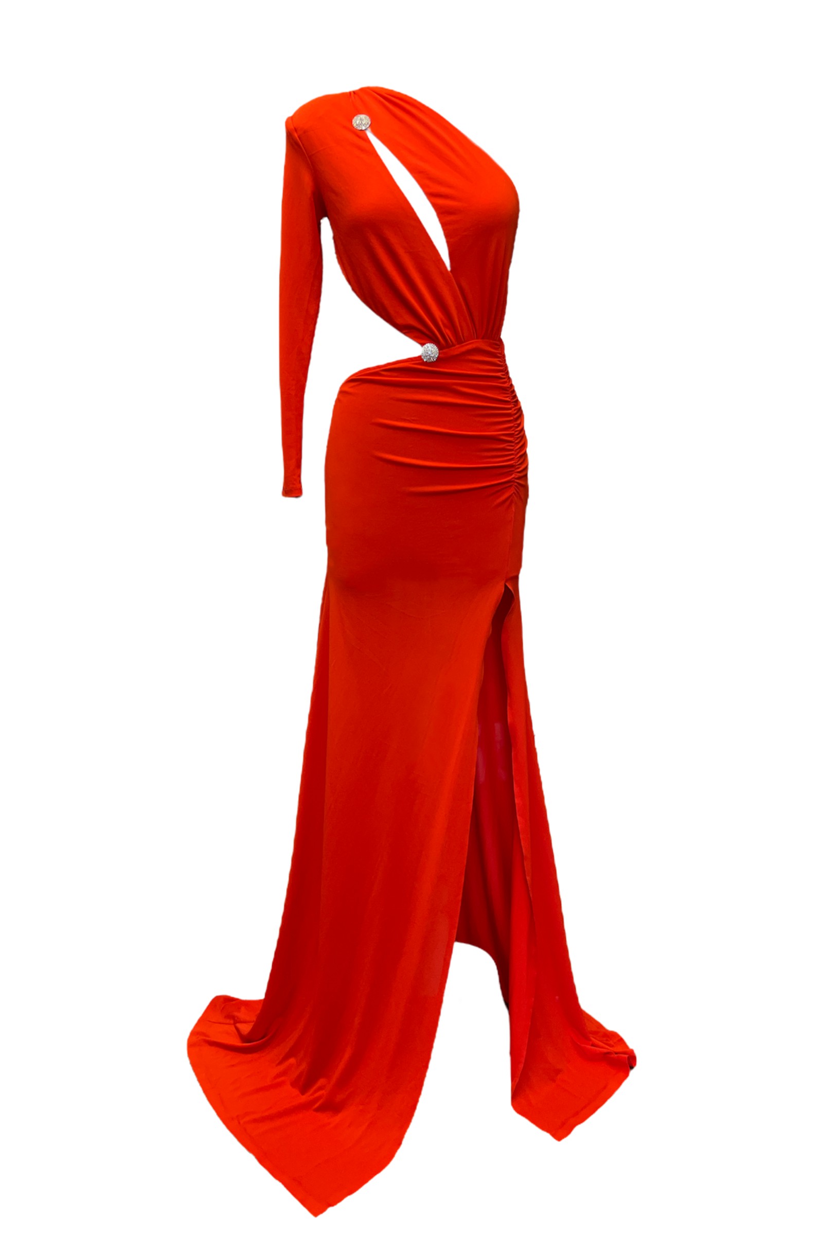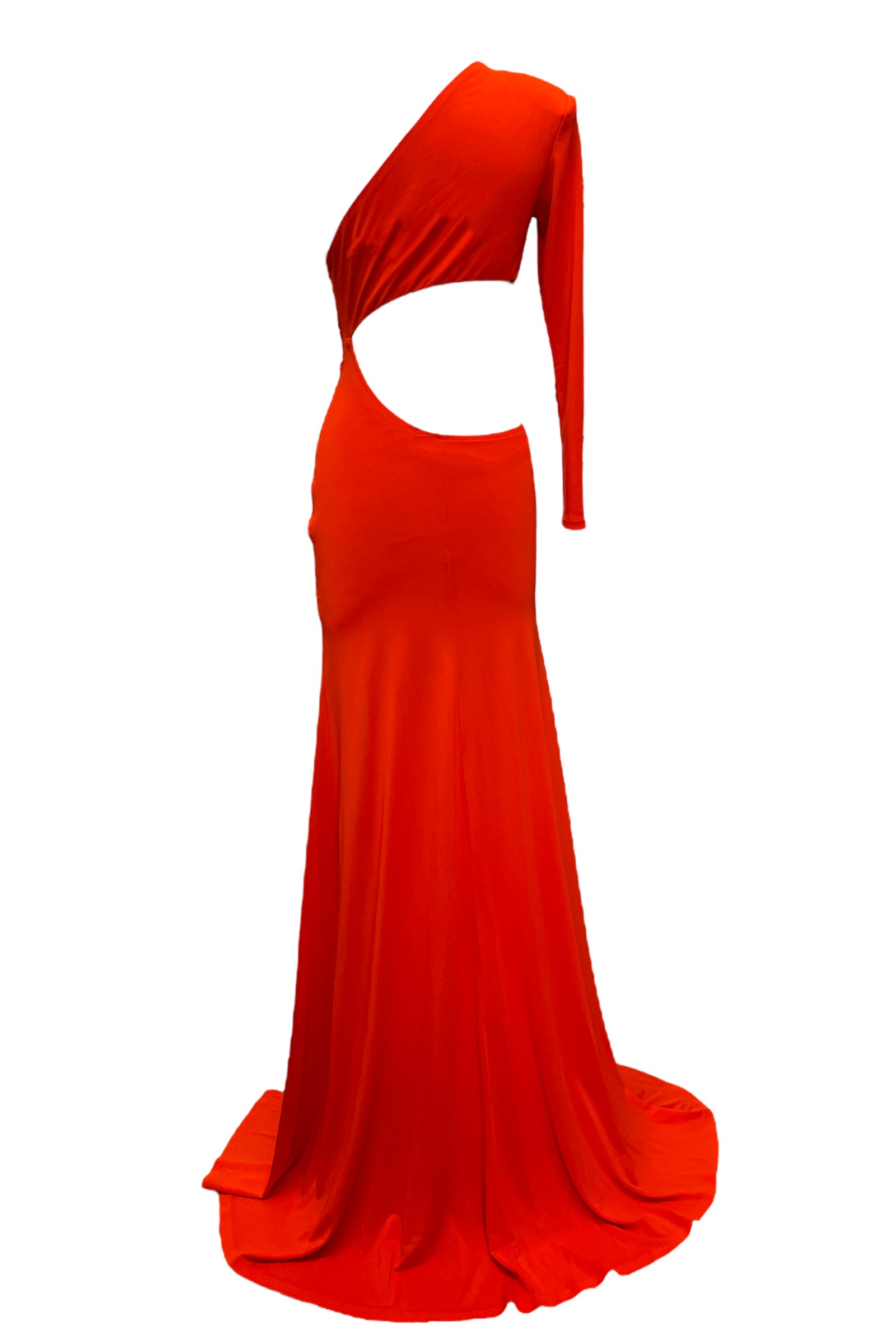 Tek kollu göğüs damla dekolteli karın ve sırt açık derin yırtmaçlı uzun jarse gece elbisesi