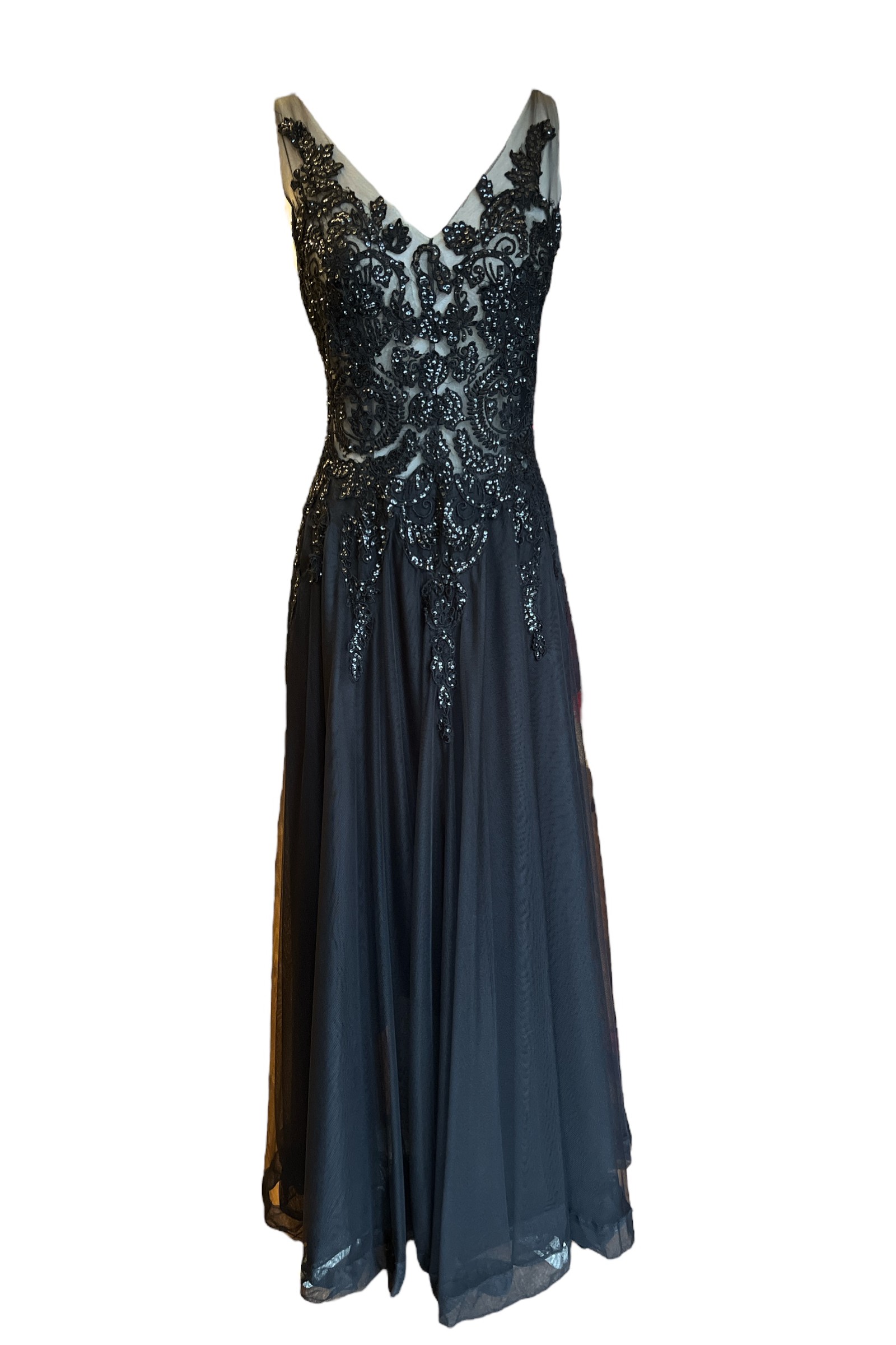 Üstü bıncuk işlemeli göğüs ve sırt dekolteli etek kısmı tül uzun gece elbisesi