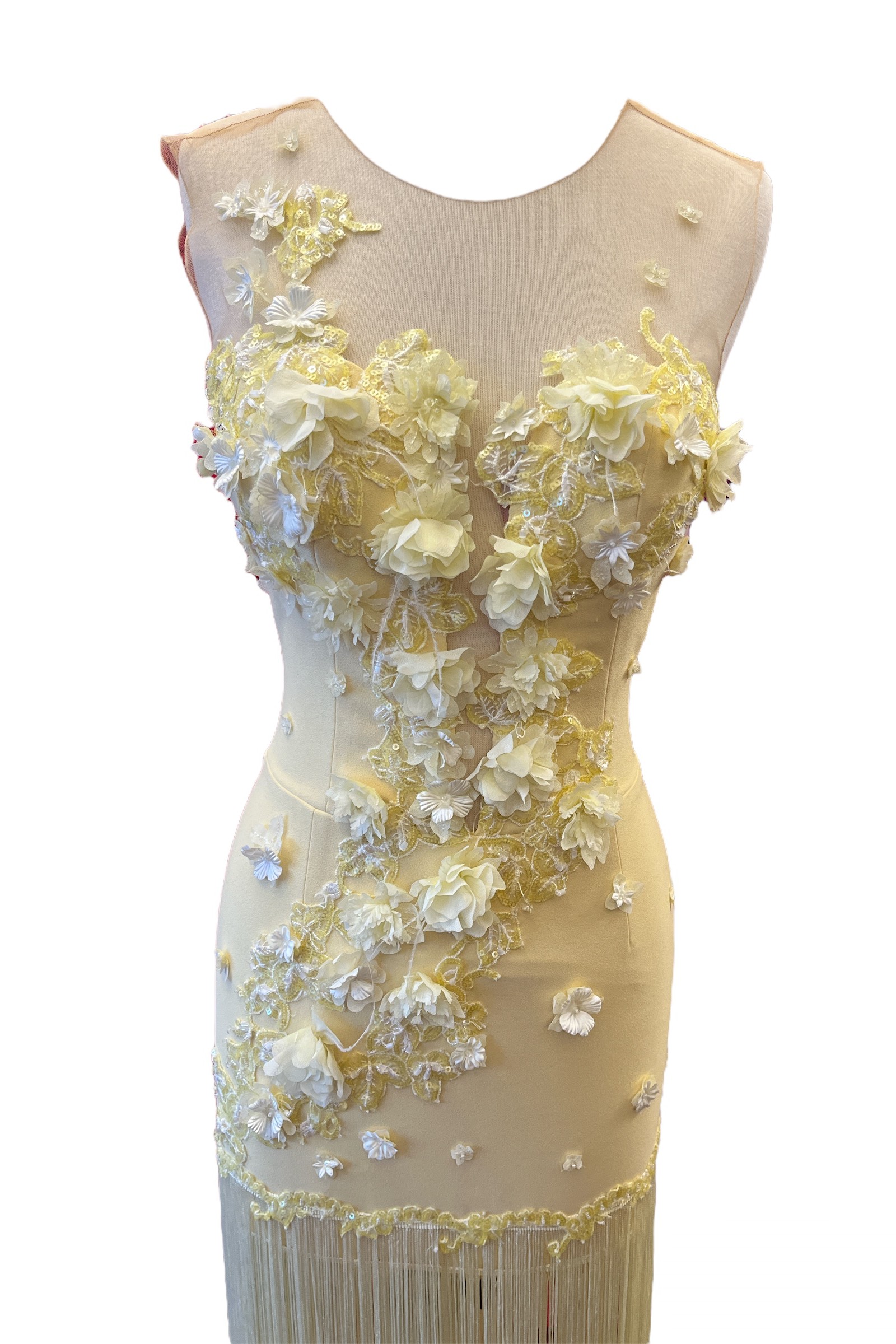 Hayalet tül üzeri üç boyutlu çiçek işlemeli sırt kısmı düğmeli mini etek sonrası püsküllü abiye elbise