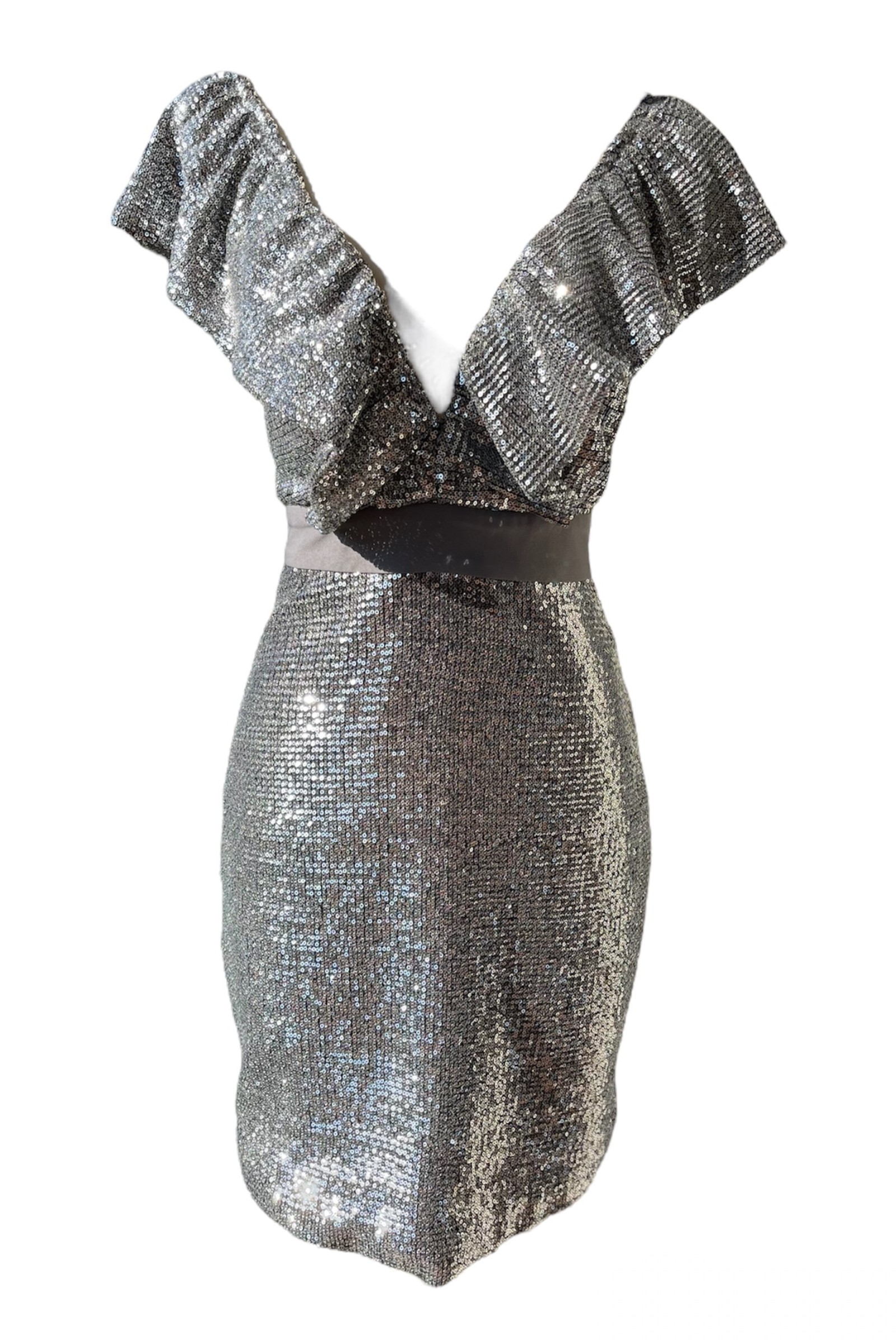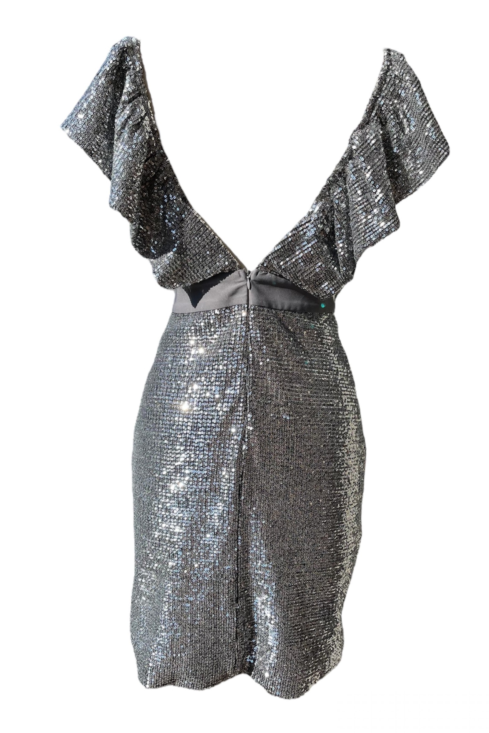 Derin V yaka göğüs kısmı volan detaylı sırtı derin V kesim beli kulak detaylı payetli mini elbise