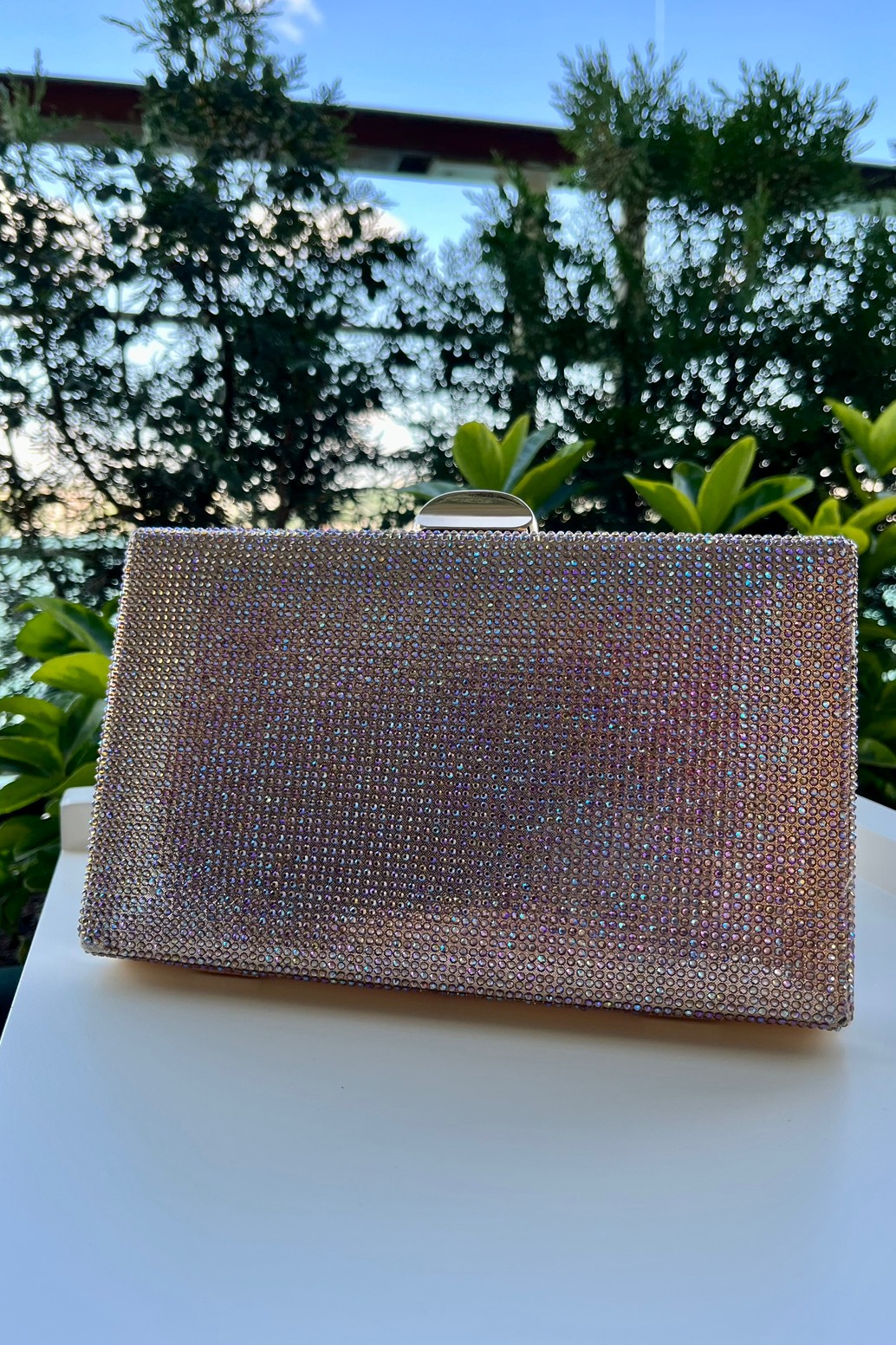 Rose Gold metal çerçeveli el çantası. İçindeki zincir ile askılı da kullanılabilir.