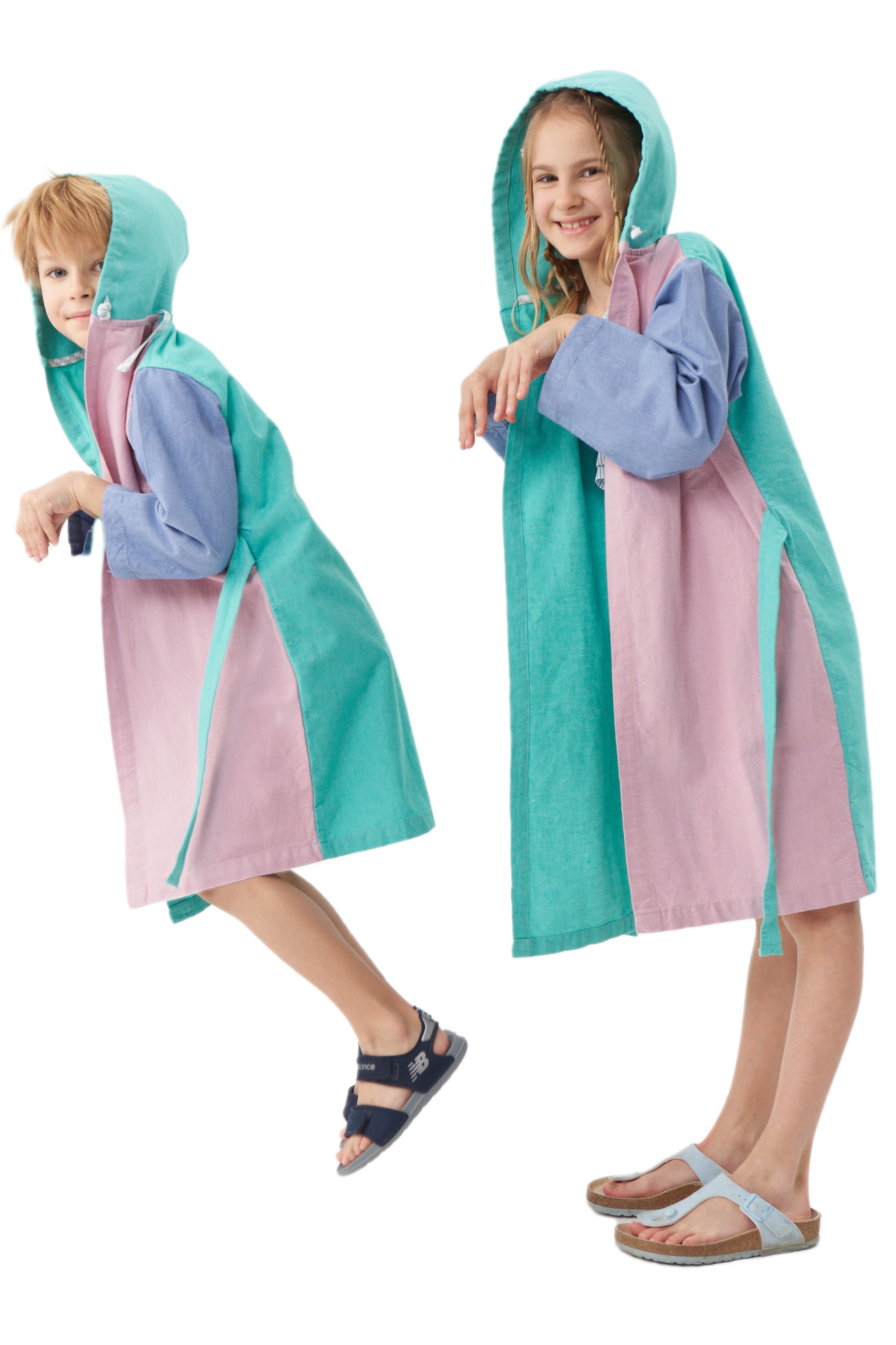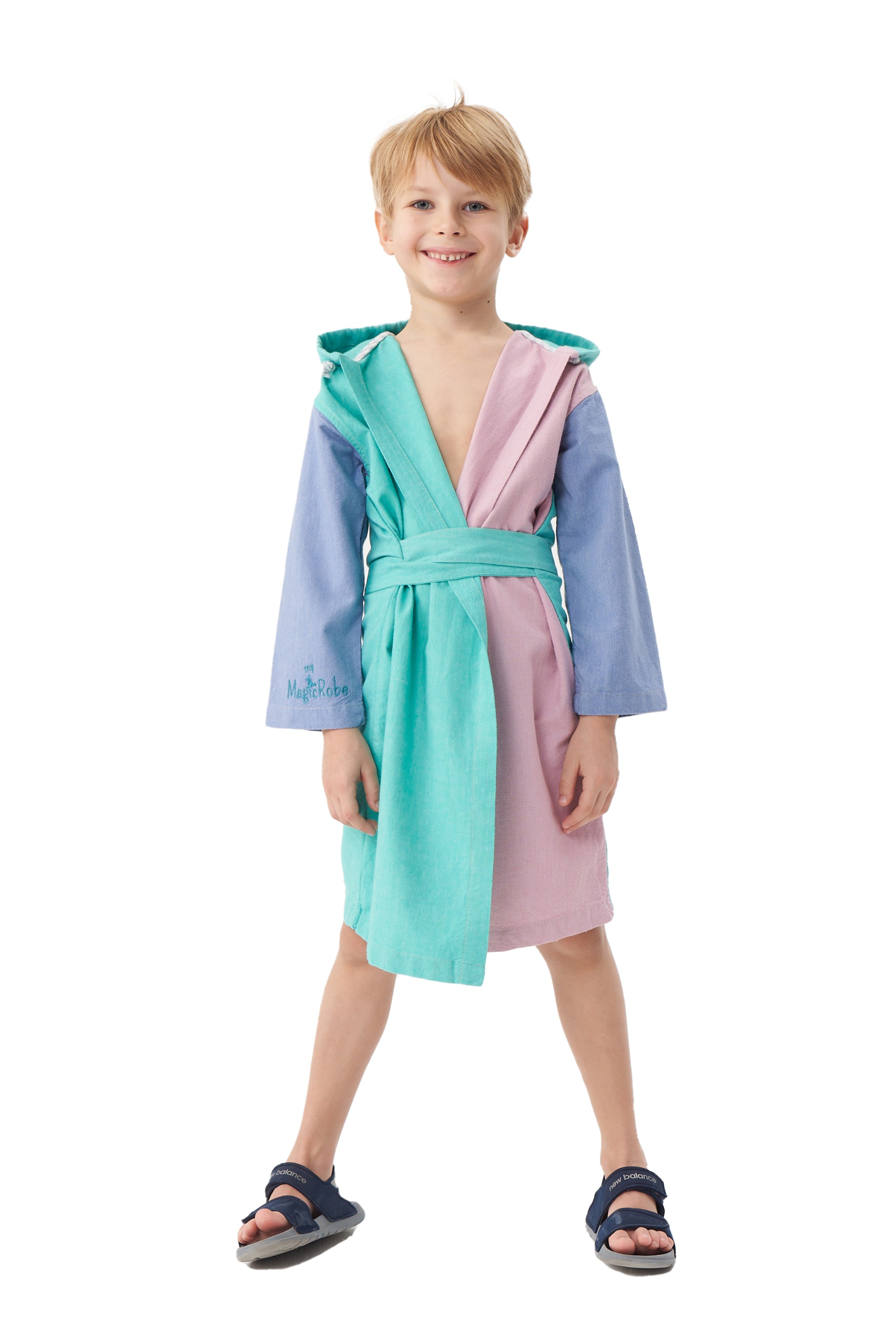 Ocean myMagicRobe ürünümüzün kollar mavi, vücudun ön tarafları pembe ve yeşildir. Sırt kısmı da yeşildir. Bu bornoz şapkasında çantaya dönüşebilir. myMagicRobe'unuzu her çantaya dönüştürdüğünüzde dalgaların sesini de yanınıza alacaksınız. Kumaşımız %100 pamuktur. Her yıkadığınızda daha yumuşak ve daha emici hale gelecektir.