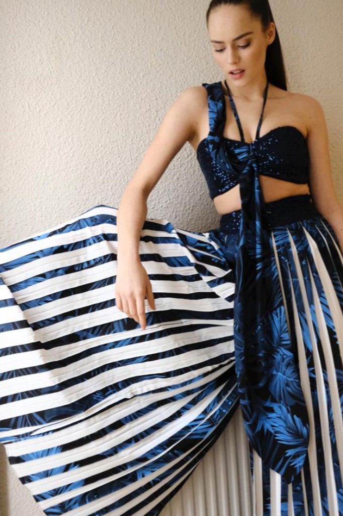 İndigo mavisi payet büstiyer. Göğüs kısmında ayrıca dijital baskılı flar detaylı ve boyundan bağlamalı. Pileli bel kısmı payet bantlı indigo baskılı etek pantolon takım