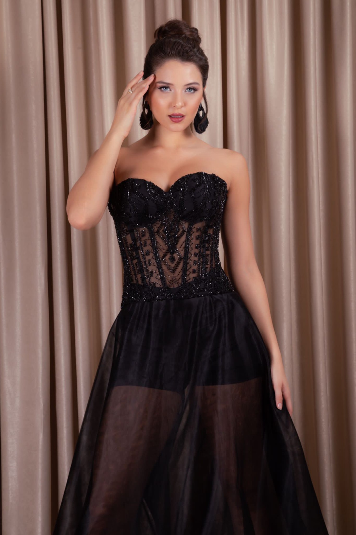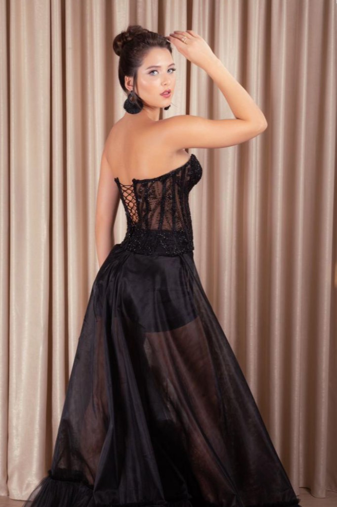 Straplez arkadan bağlamalı üstü el işlemeli büstiyer.
