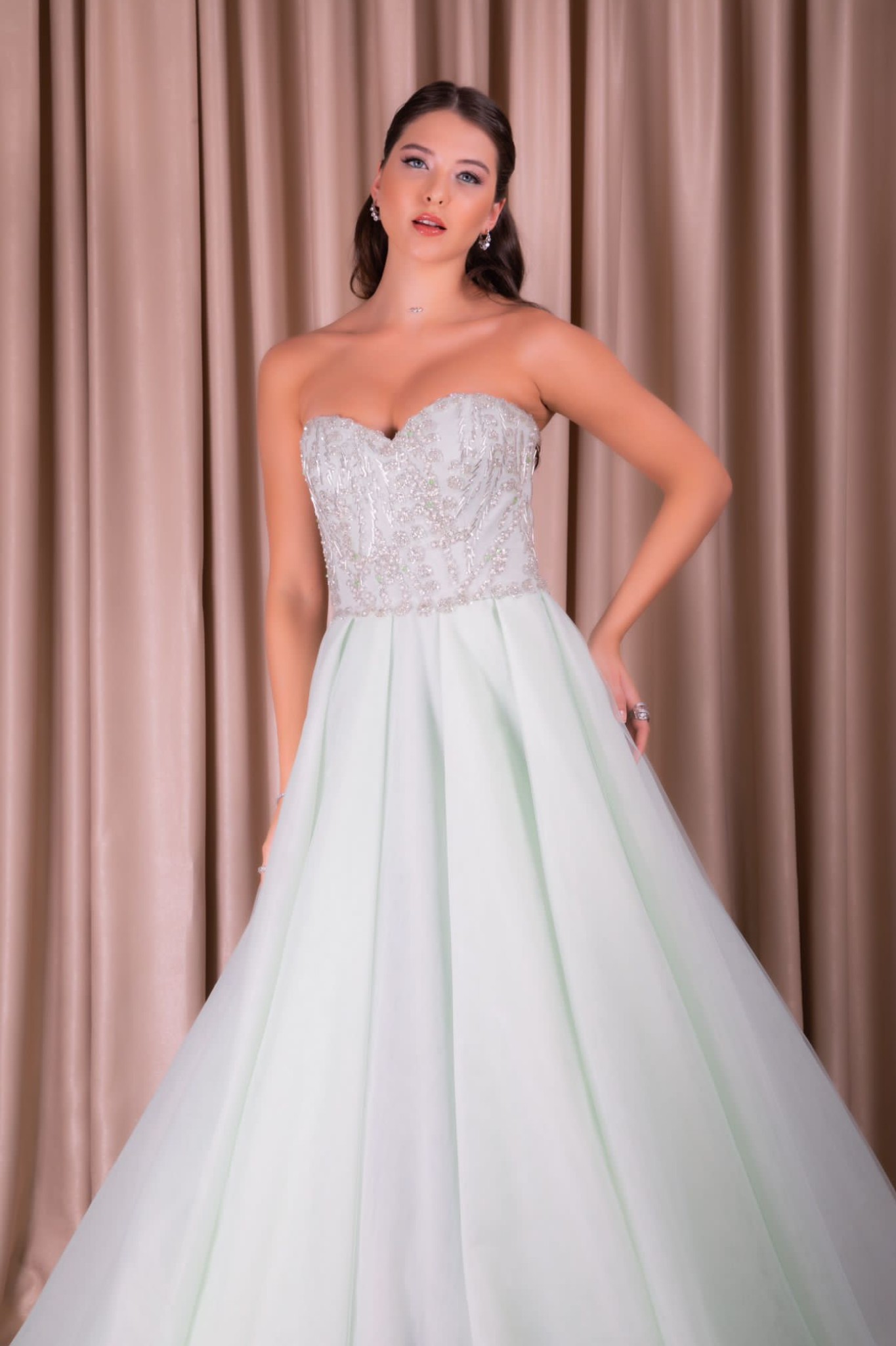Straplez üst kısmı el işlemeli etekleri tül ve içi astarlı gece elbisesi