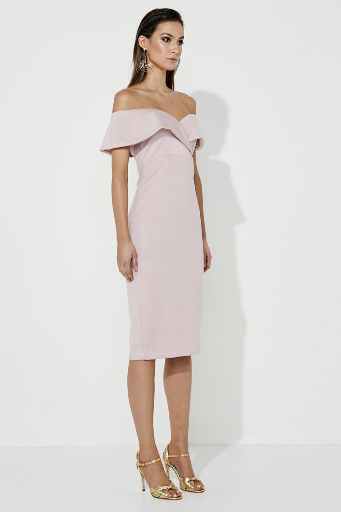 Düşük omuz pudra arkadan mini yırtmaçlı kokteyl elbisesi