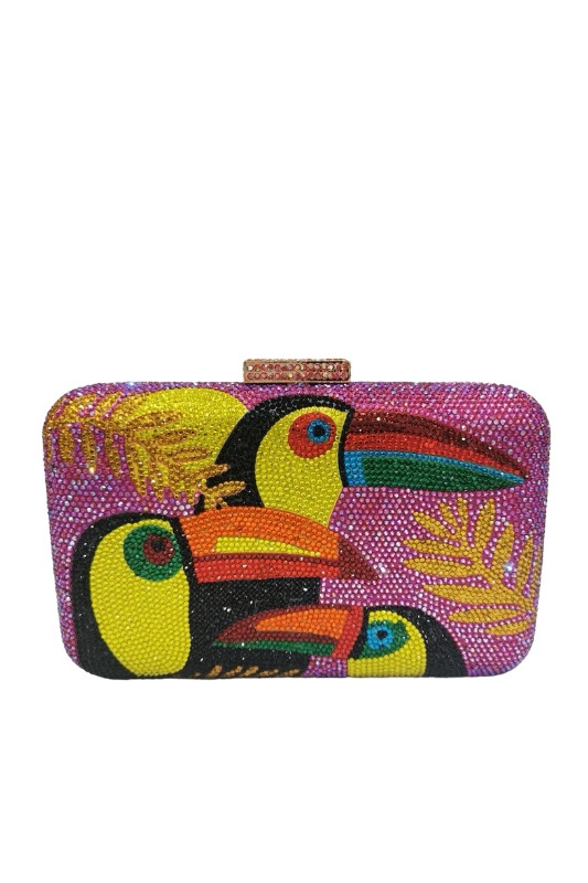 Papağan desenli kristal taşlı zincir askı ile de kullanılabilen el çantası