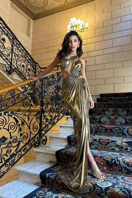 Göğüs ve bel dekolteli sırtı açık kıvrak yırtmaçlı bel göğüs dekoltesi ayarlanabilir ve ya değişebilir, gold gece elbisesi