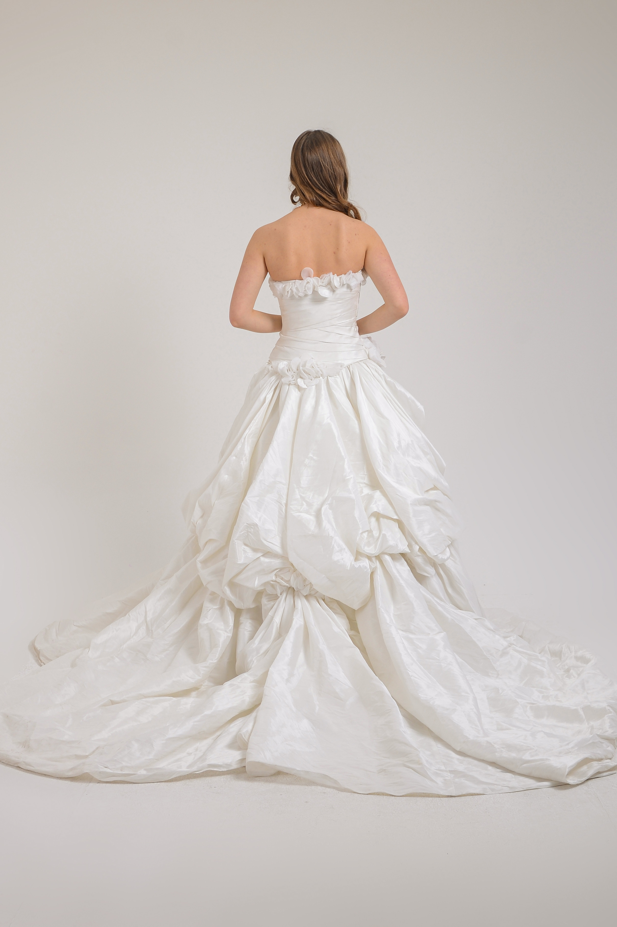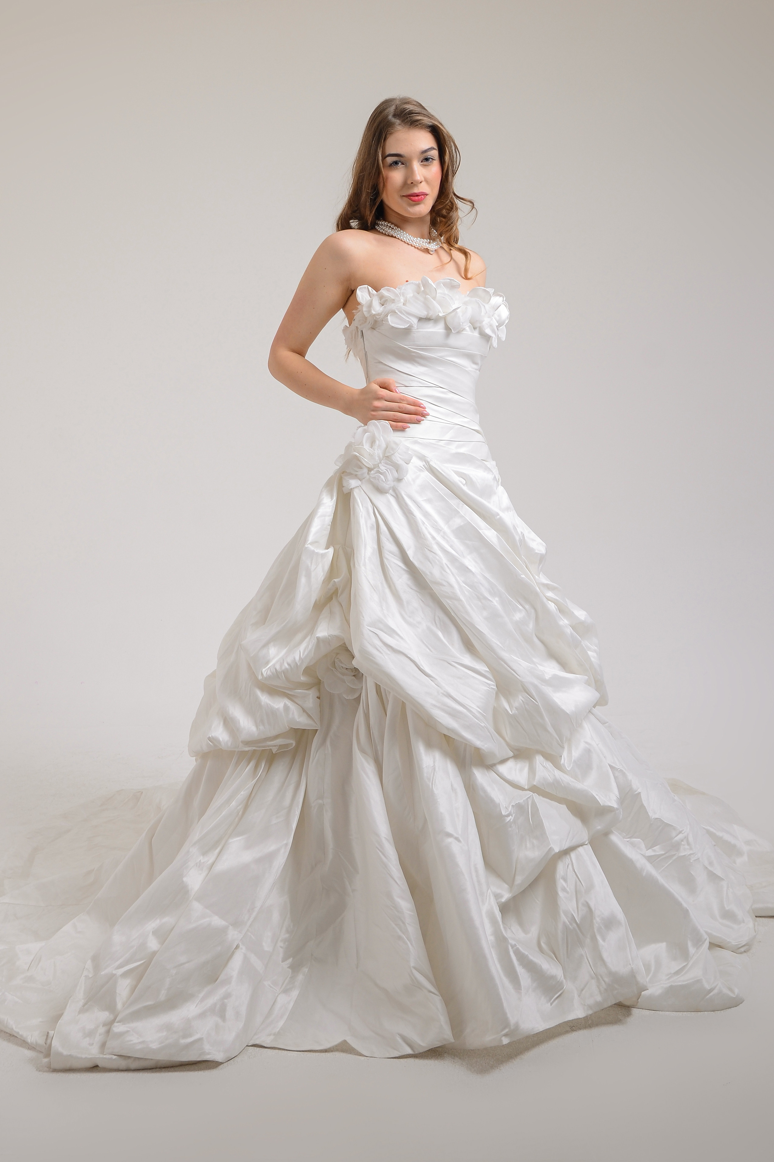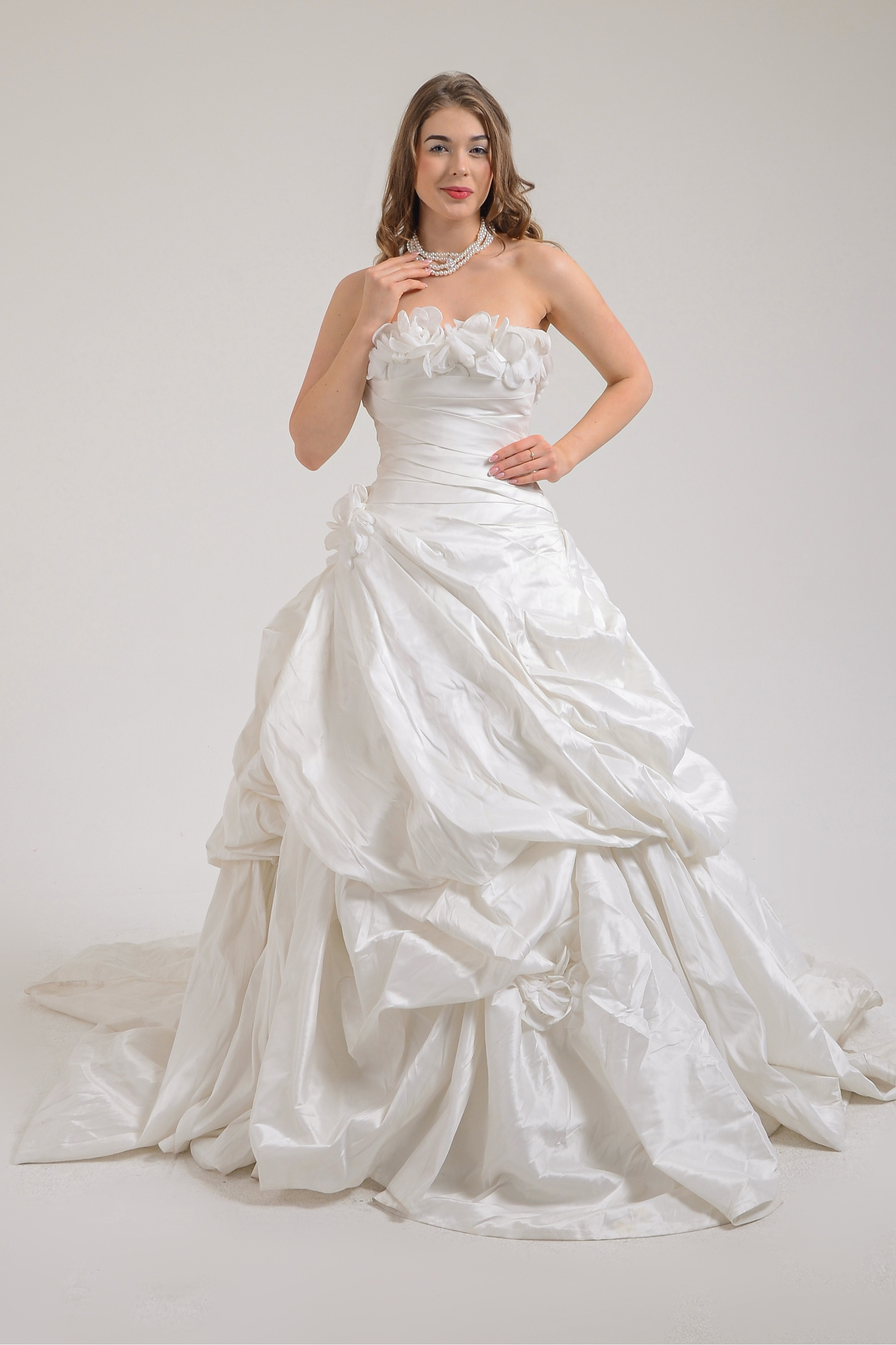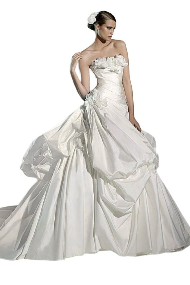 Straplez etekleri balon volanlı göğüs üstü çiçek detaylı uzun kuyruklu gelinlik