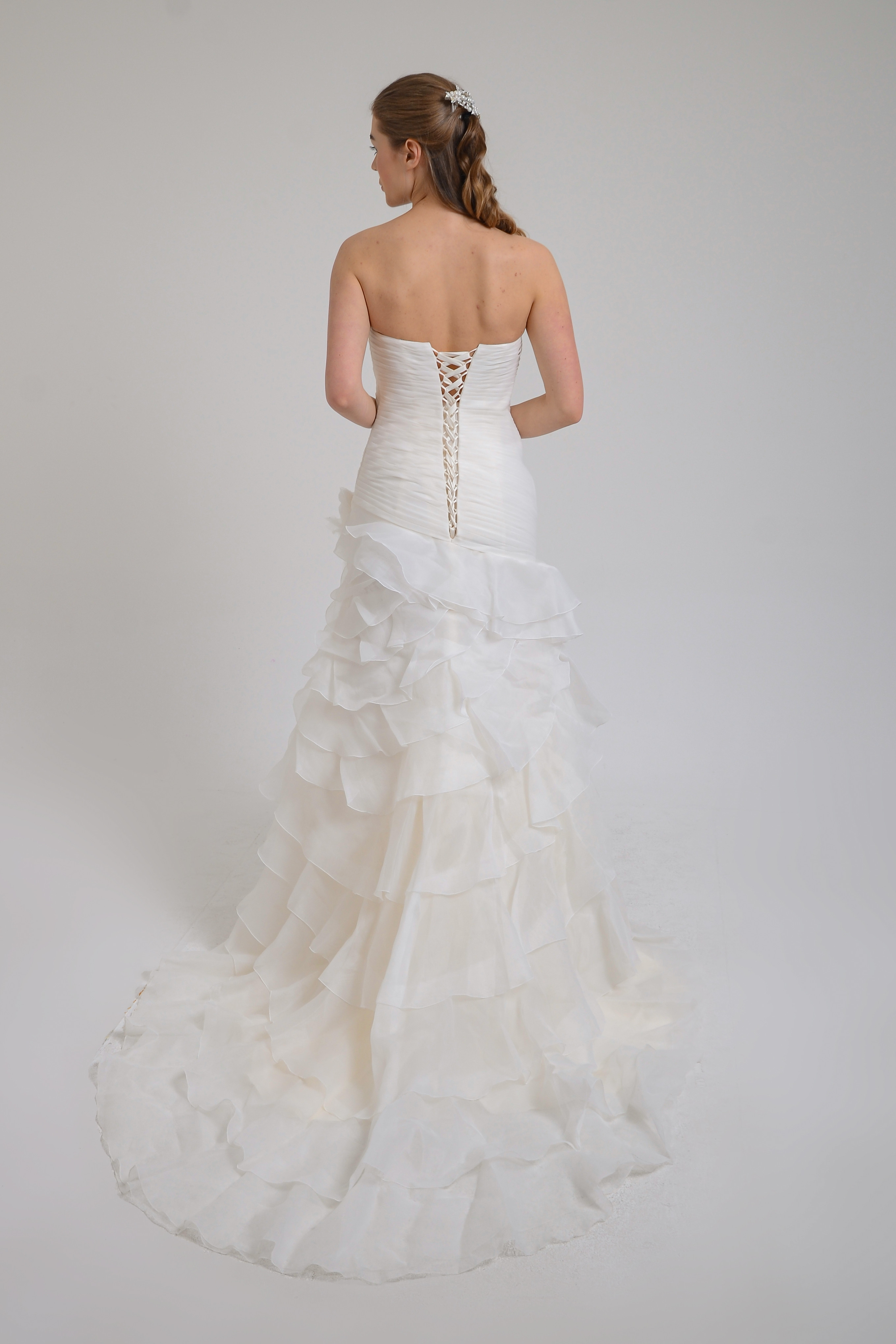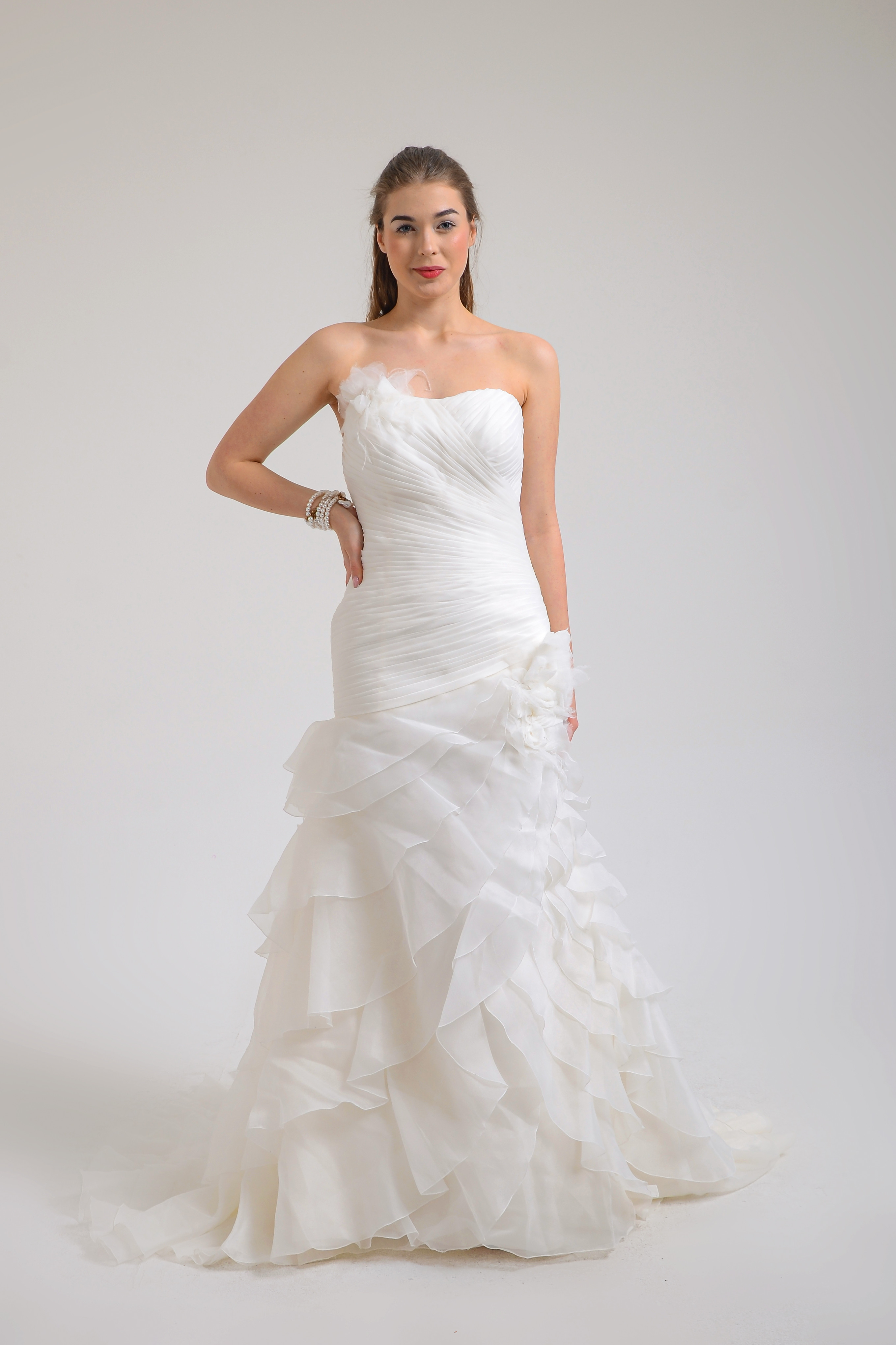 Straplez balık model üst kısmı güpür ve kristal boncuk işlemeli gelinlik. Bu gelinlik arkadan ayrıca takıp çıkarılabilen fırfırlı uzun kuyruklu ek etek ile de kullanılabilir.