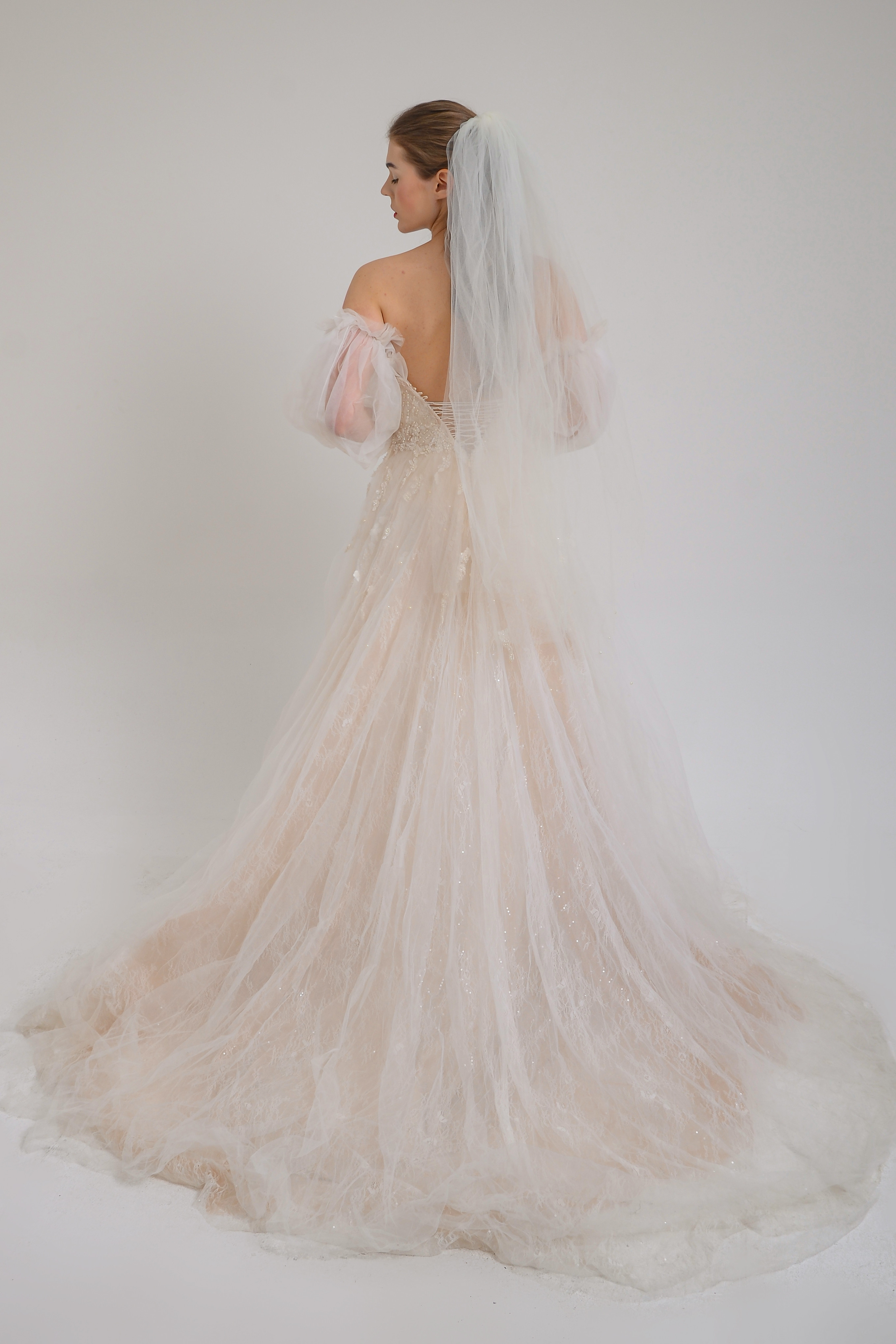 Straplez öndenderinnV kesim tül çıkabilen balon kol detaylı derin tek yırmlı uzun kuyruklu gelinlik