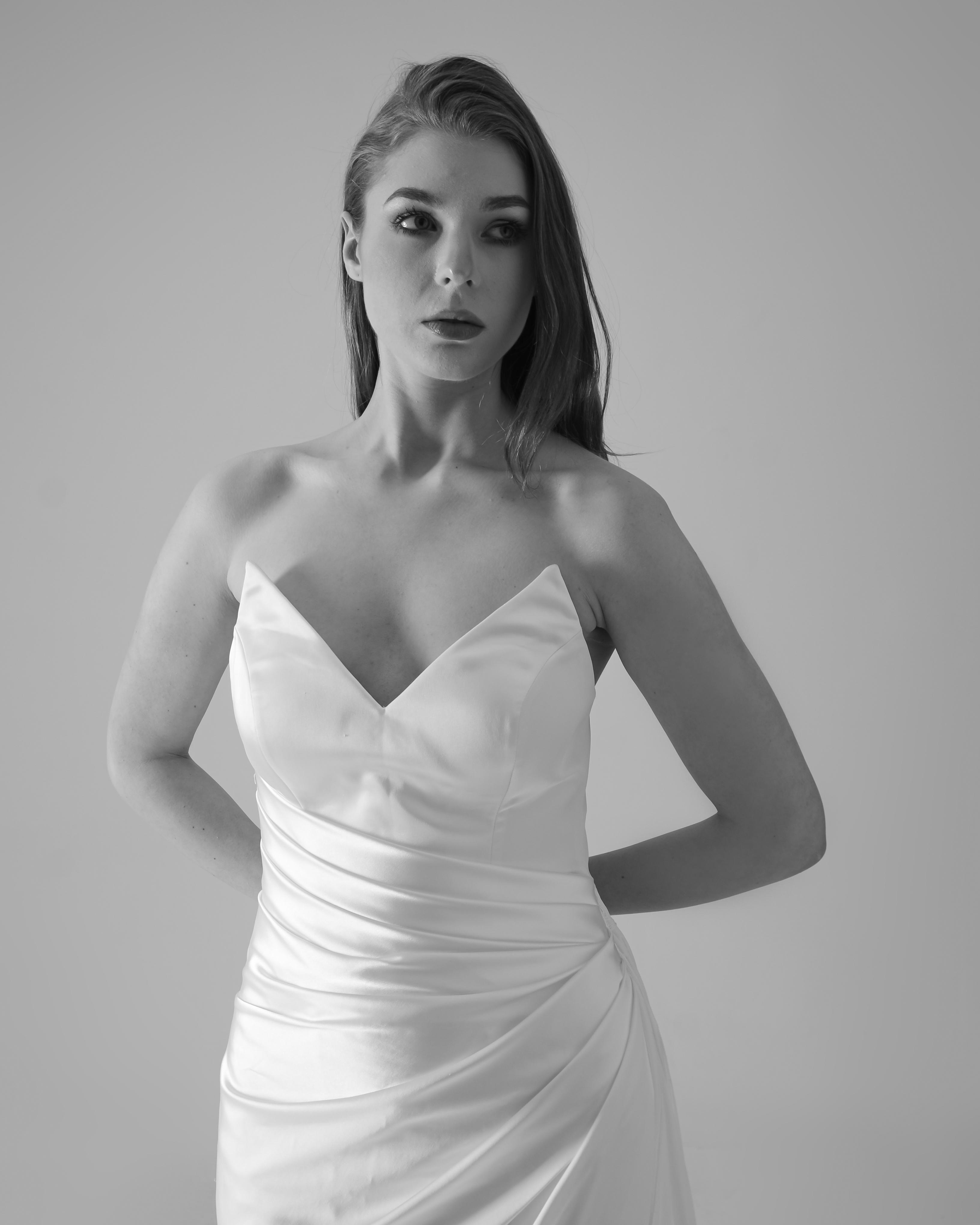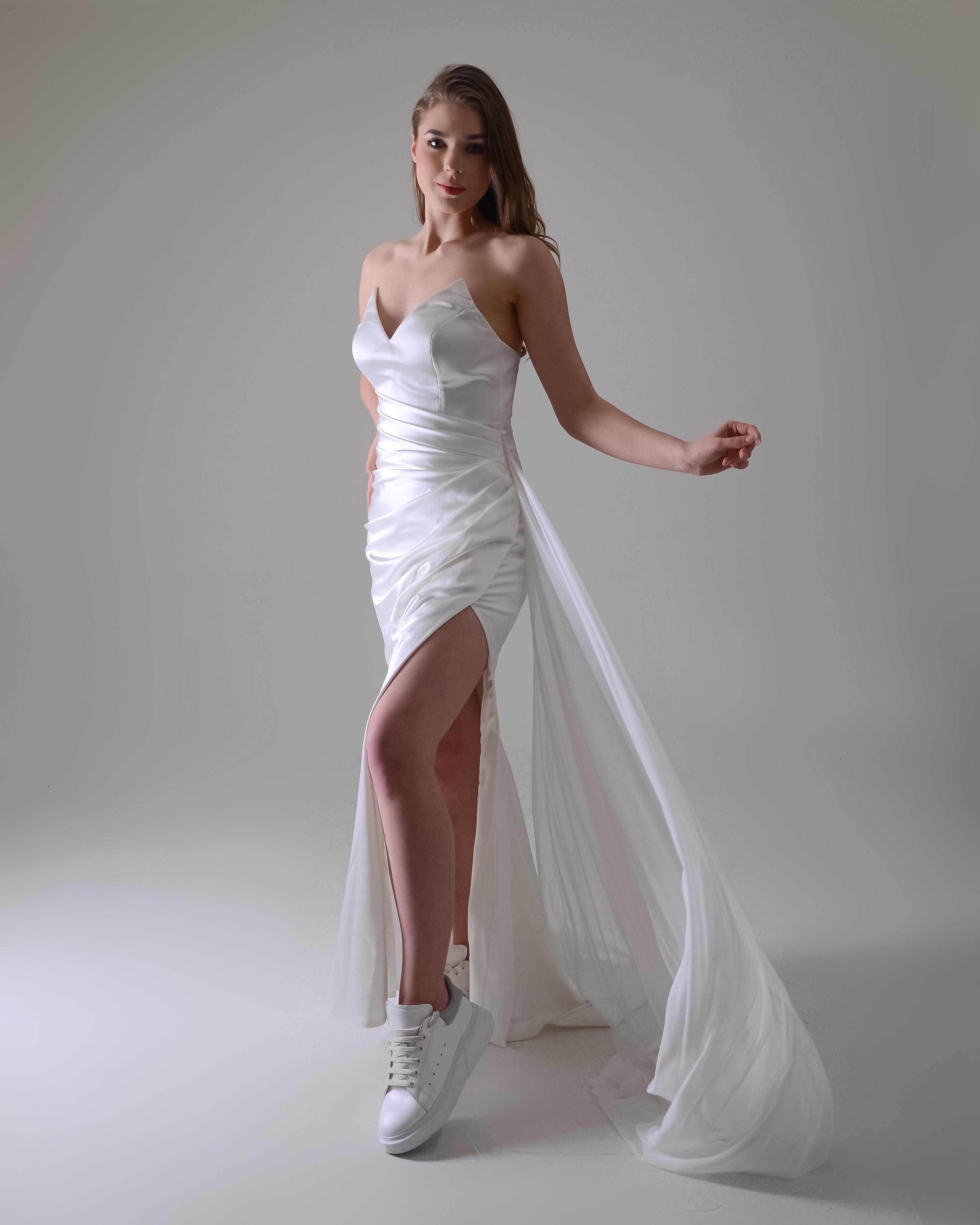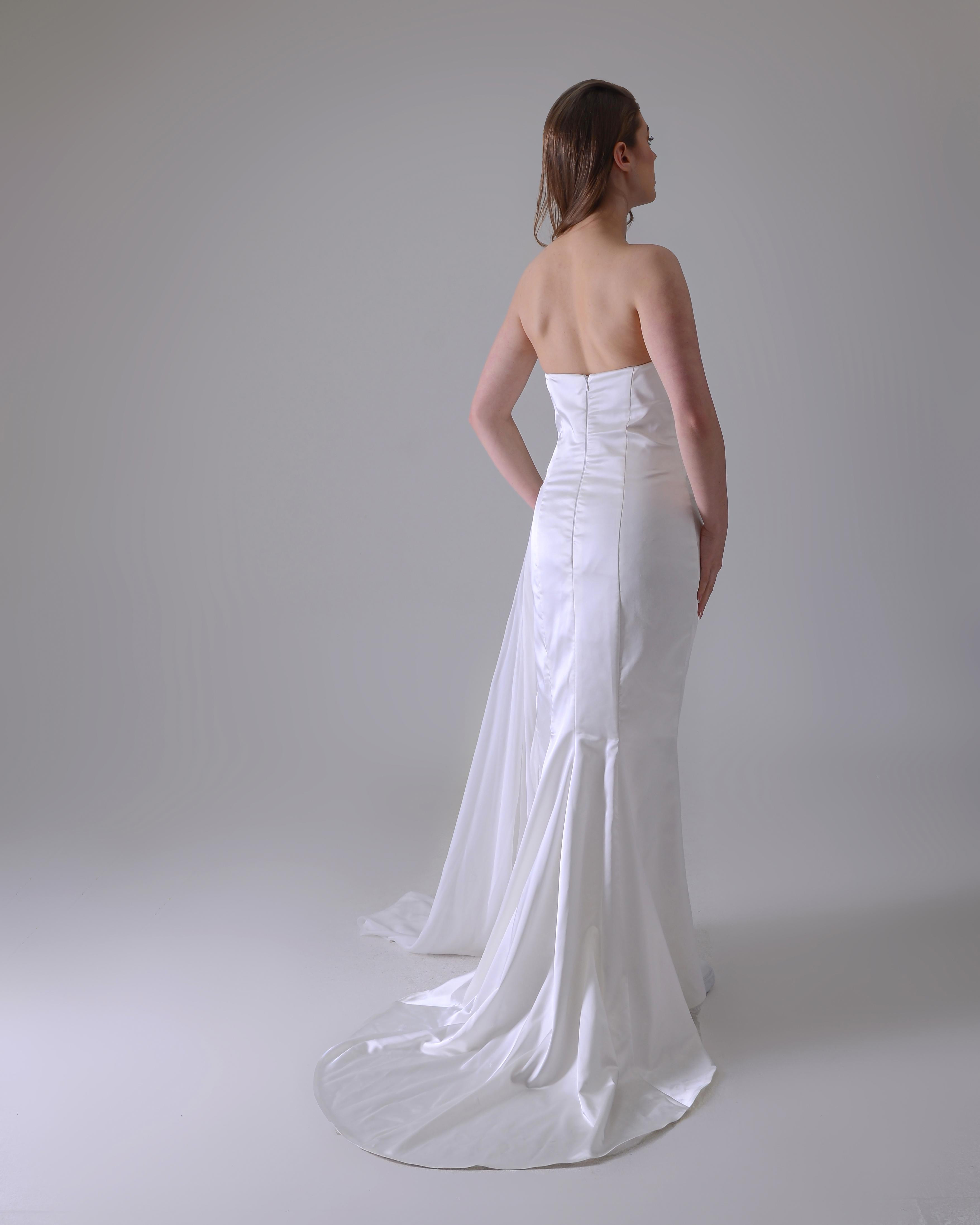 Straplez önden drapeli yırtmaçlı gelinlik