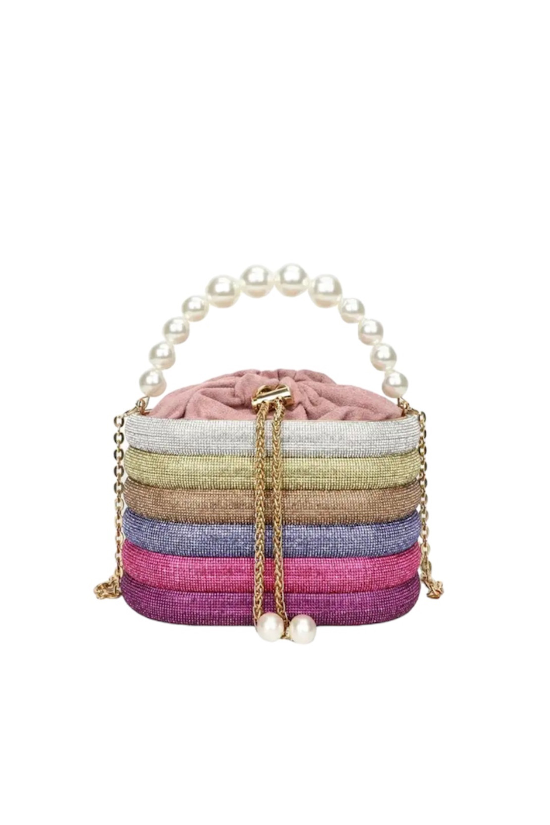 Işıltılı çok renkli içi keseli uzun zincir askılı ya da elde tutulabilen büyük inci kulplu el çantası