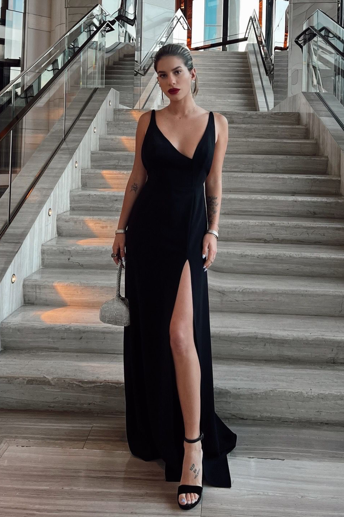 İnce askılı göğüs kısmı asimetrik derin dekolteli sırtı açık derin yırtmaçlı uzun elbise