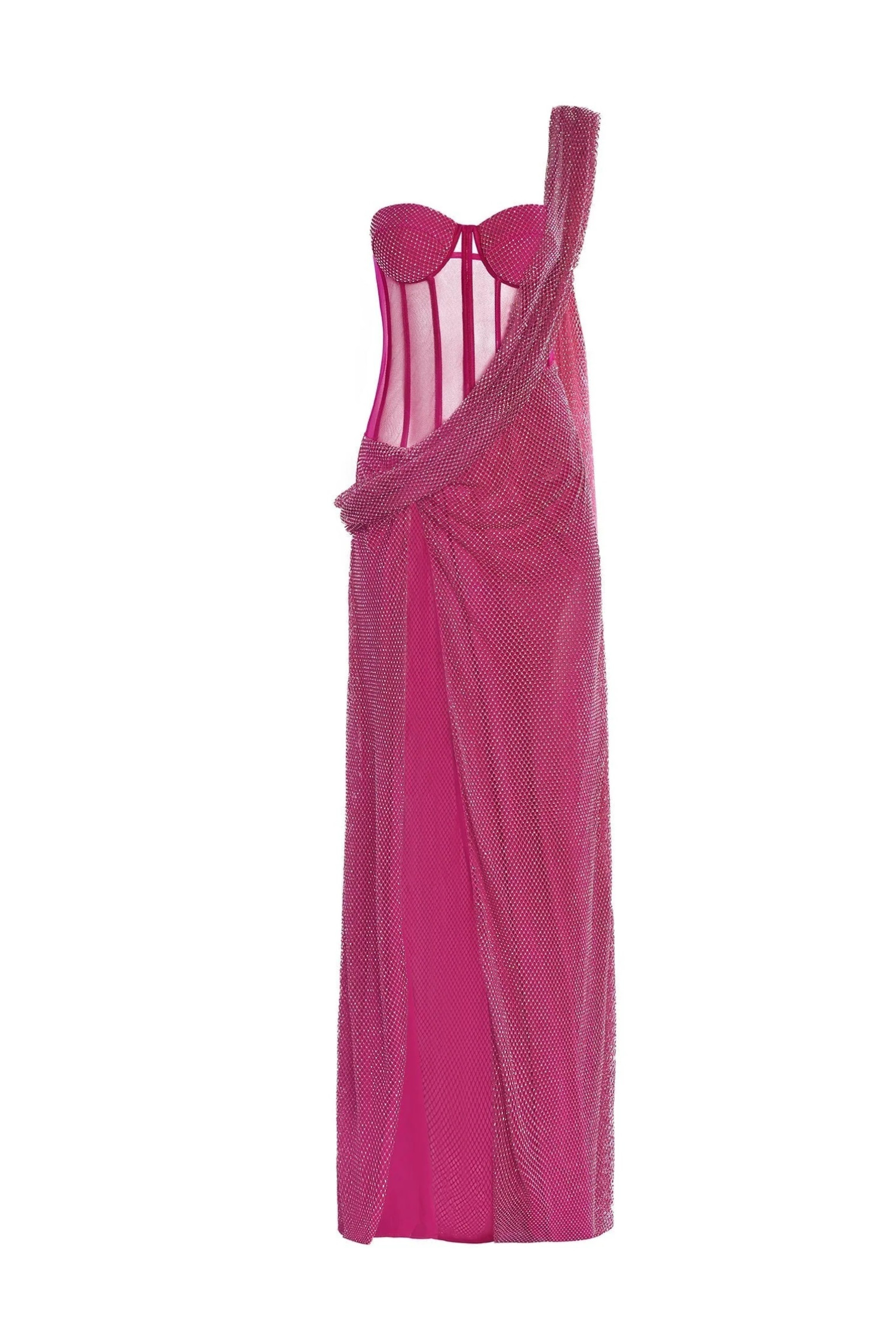 Sidney Elbisesi, gece kıyafetlerine modern bir görünüm kazandırmak için ışıltıyıcanlı tonları uyumlu hale getiriyor. Kemikli korsaj, dolgulu kuplar ve derin yan yırtmaçlıdır. Bu görünüm, omuzdan bele kadar uzanan dökümlü kolu ve yere adan uzanan kuşakla daha da öne çıkıyor. Parlak, kristal taşlarla süslenmiş kumaştan, parlak sıcak pembe tonda üretilen bu elbisemizi bir sonraki etkinliğinizde tercih edebilirsiniz.