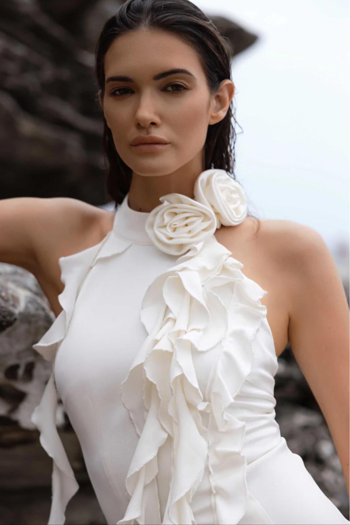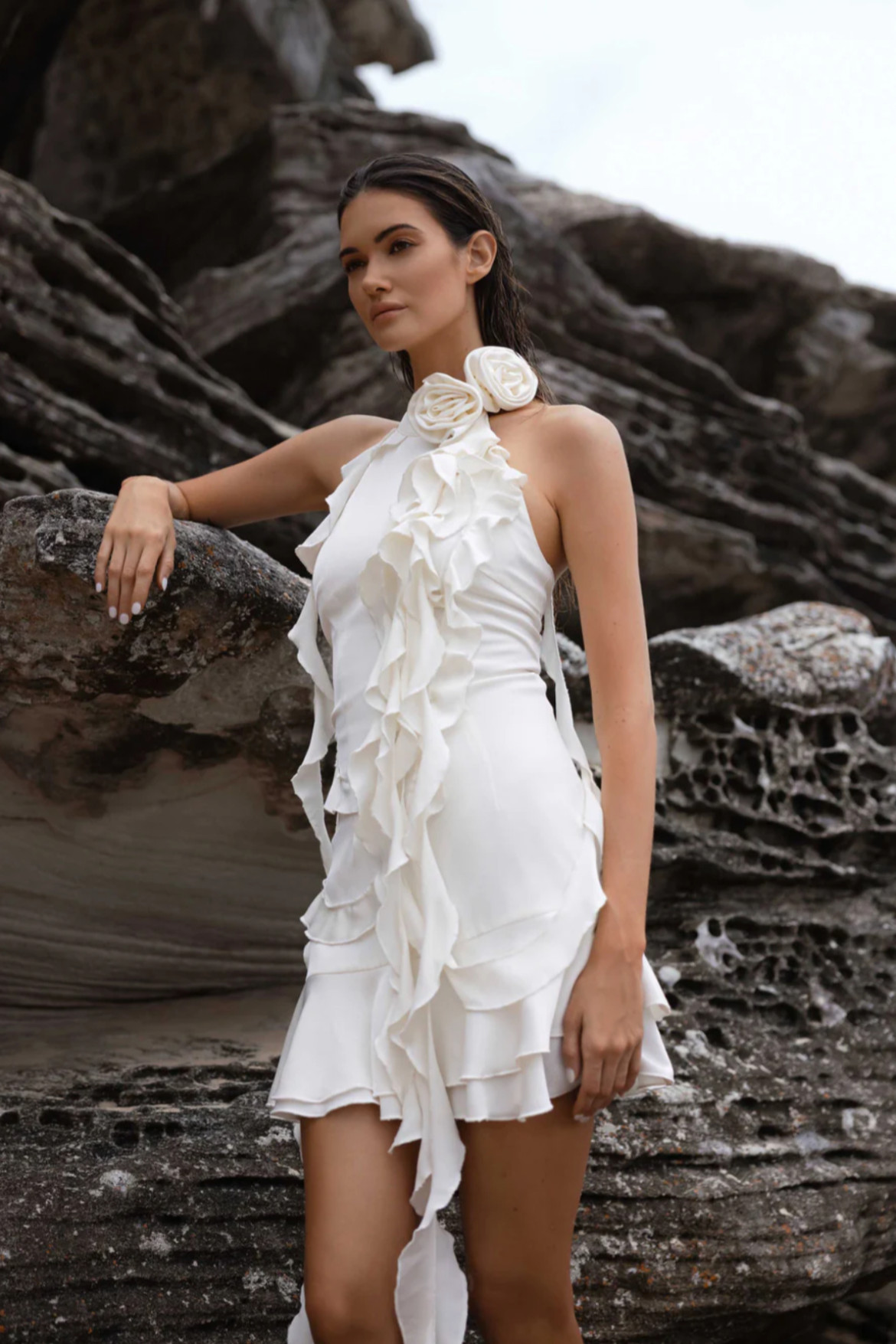 Halter yaka boyun kısmı beyaz gül detaylı sırtı açık mini Beyaz elbise